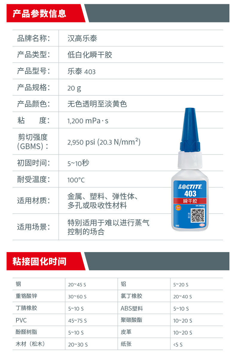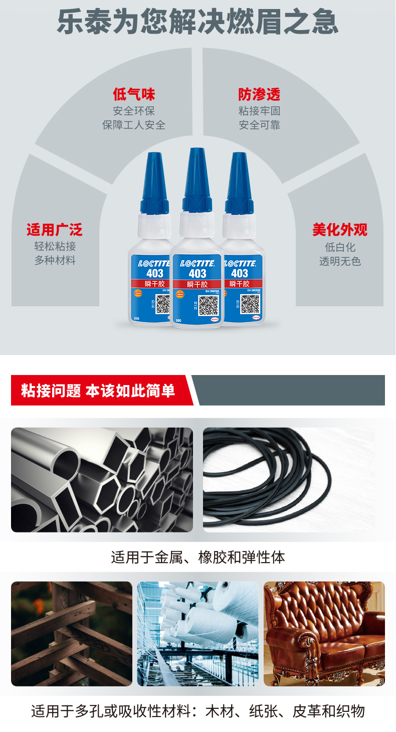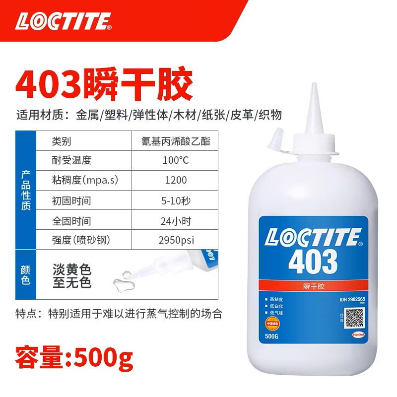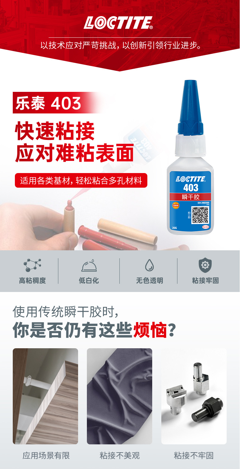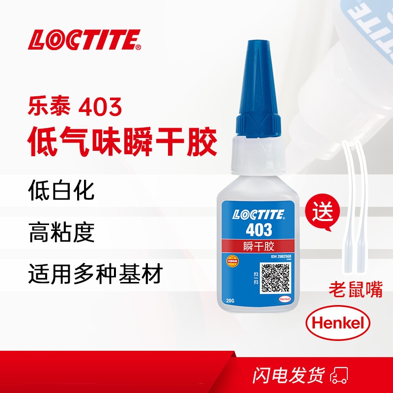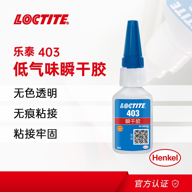 LOCTITE® 403 是一款低气味、低白化的瞬干胶。这款中粘度粘合剂适用于对气味和/或低白化有要求的场景。LOCTITE 403 可与 LOCTITE® SF 770 等底涂剂配合使用,实现金属、弹性体和塑料的快速粘合,包括难粘塑料(PP、PE、PTFE)。
