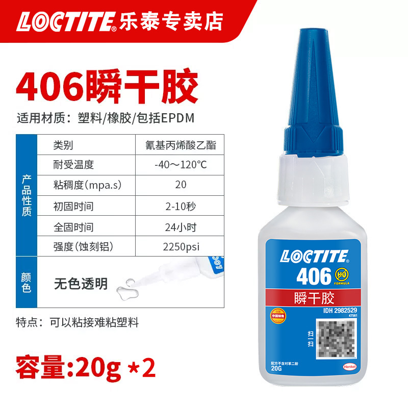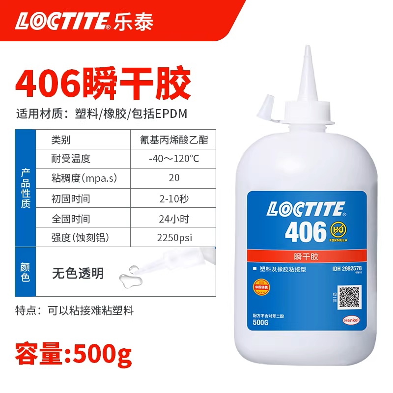 LOCTITE® 406 是一款低粘度瞬干胶,专门设计用于塑料和橡胶的快速粘合。可在几秒内固定附着的组件并快速硬化,形成超薄粘合层。使用底涂剂 LOCTITE® SF 770,可实现难粘材料(PP、PE、PTFE)的组装。
