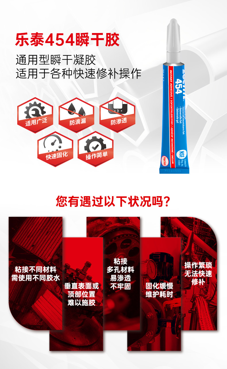 LOCTITE® 454 是一款具有凝胶粘度的瞬干胶,专为大尺寸粘接间隙和竖直粘接场景而设计。借助 LOCTITE® SF 770 等底涂剂,其可快速粘合多种材料 — 金属、弹性体和塑料,包括难粘塑料(PP、PE、PTFE)。LOCTITE 454 还适用于粘合多孔材料,例如木材、纸张、皮革和织物。本产品也很适合所有快速维修工作。