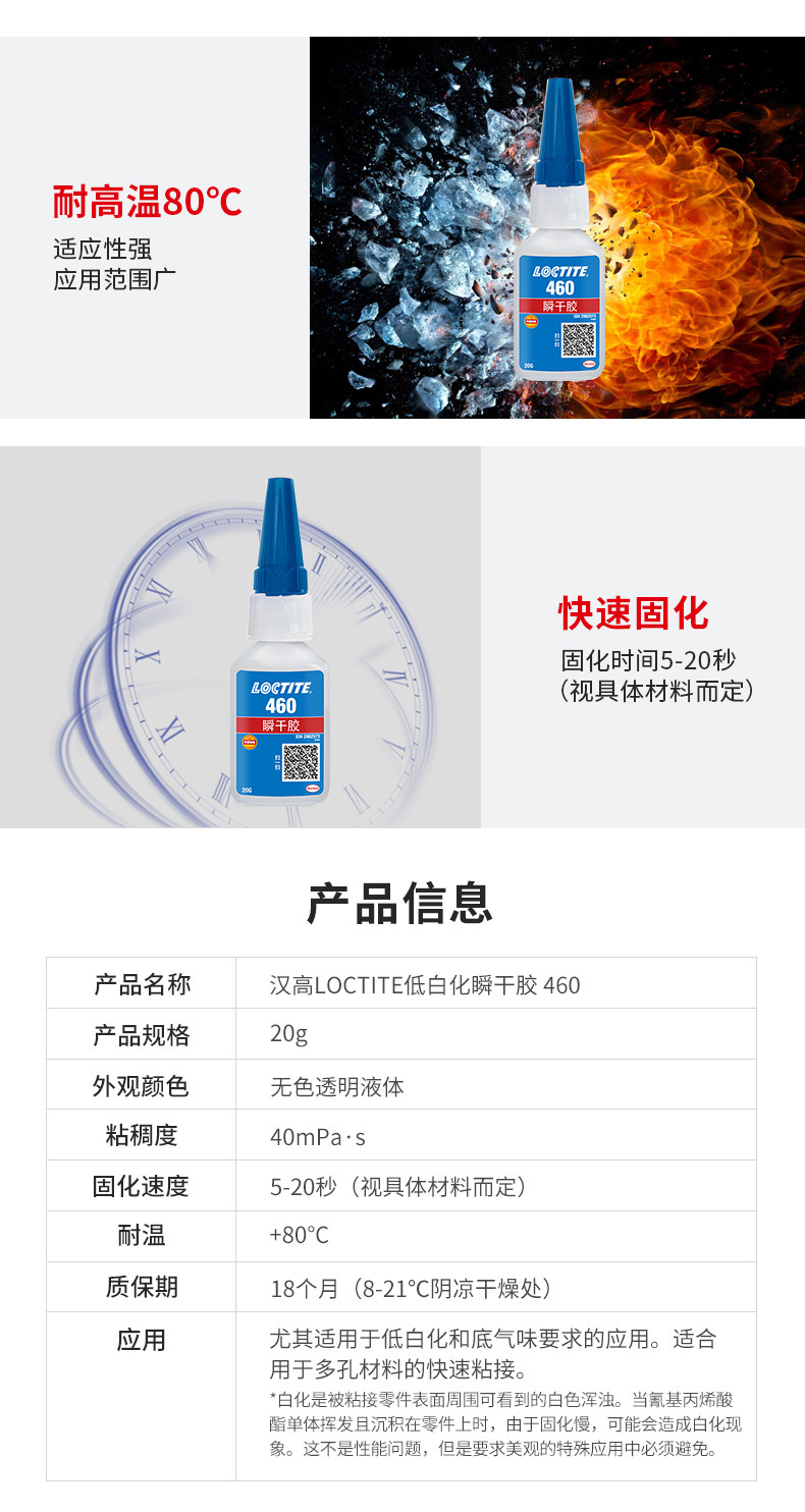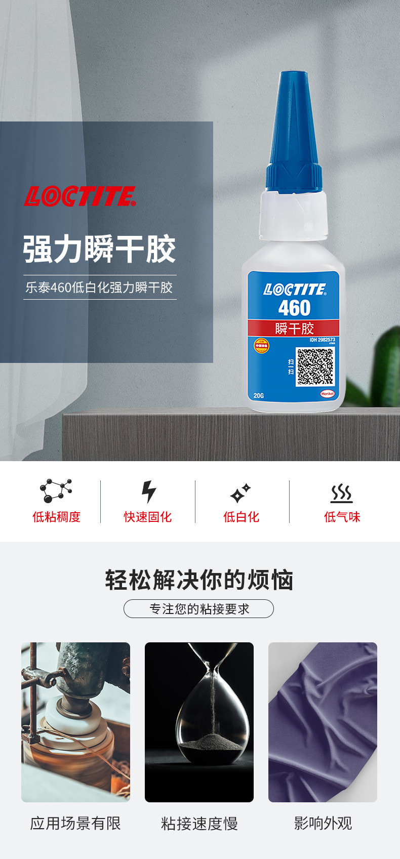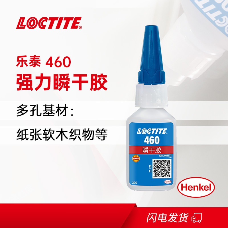 LOCTITE® 460 是一款低气味、低白化的瞬干胶。这款低粘度粘合剂适用于对气味和/或低白化有要求的场景。LOCTITE 460 可与 LOCTITE® SF 770 等底涂剂配合使用,实现金属、弹性体和塑料的快速粘合,包括难粘塑料(PP、PE、PTFE)。
