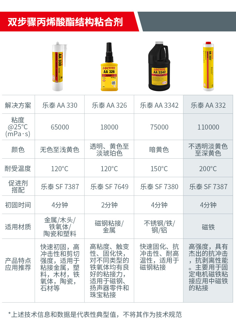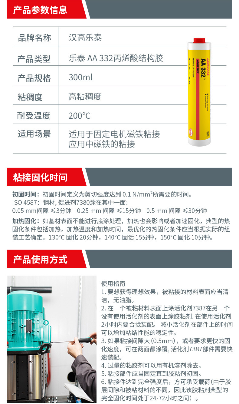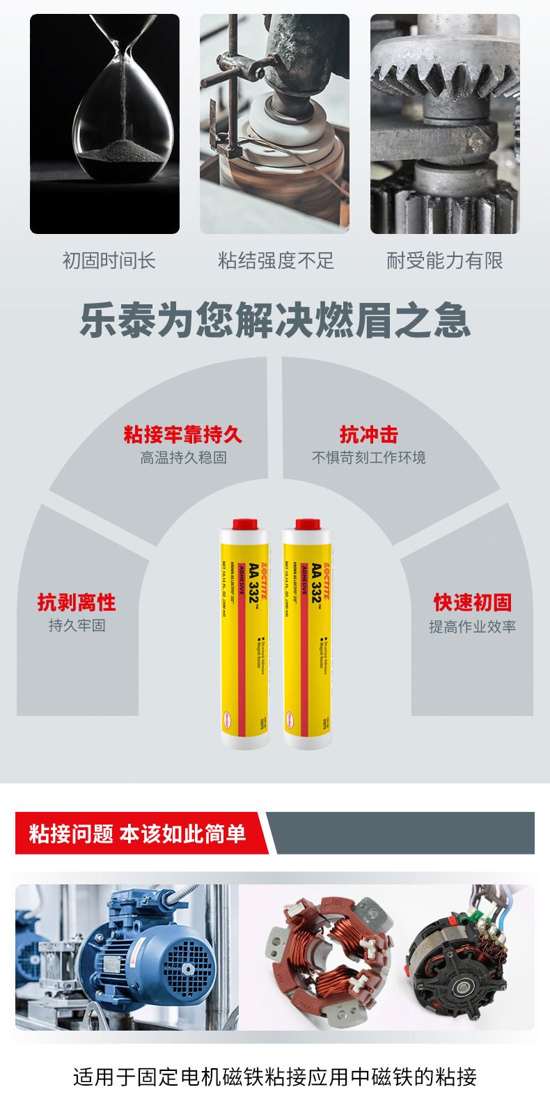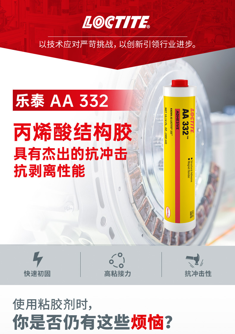 LOCTITE®AA 332™主要用于固定电机磁铁粘接应用中磁铁的粘接。本产品可形成坚韧,耐久粘接,具有杰出的抗冲击,抗剥离性能。