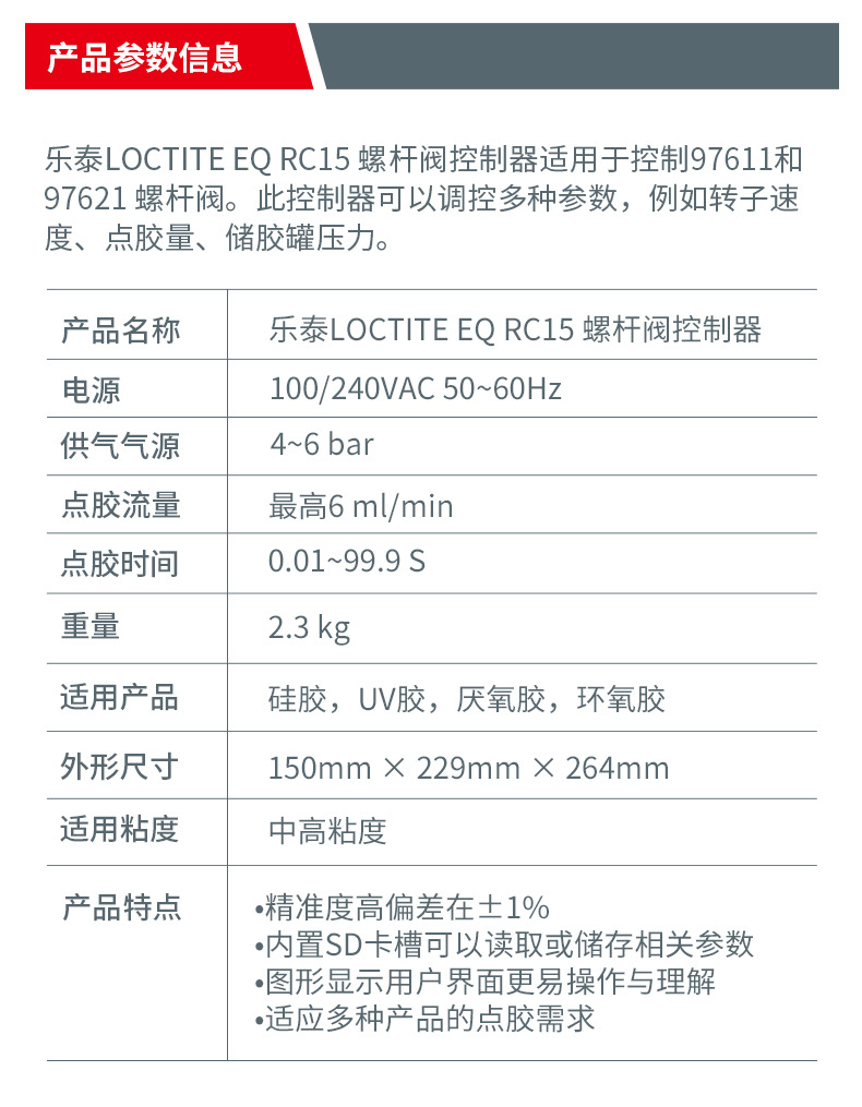 LOCTITE EQ RC15 螺杆阀控制器适用于控制电转子泵 9761和97621 紧凑型转子泵。此控制器可以调控多种参数,例如转子速度、点胶量、储胶罐压力。