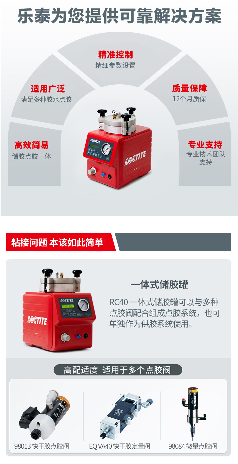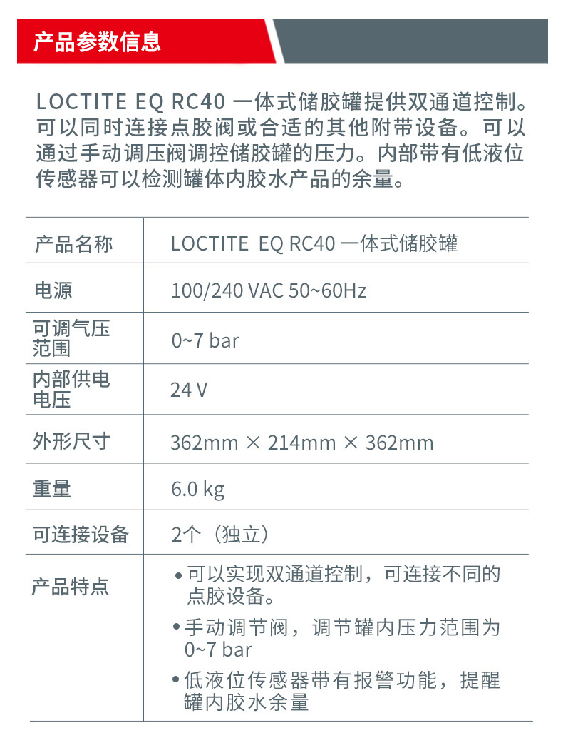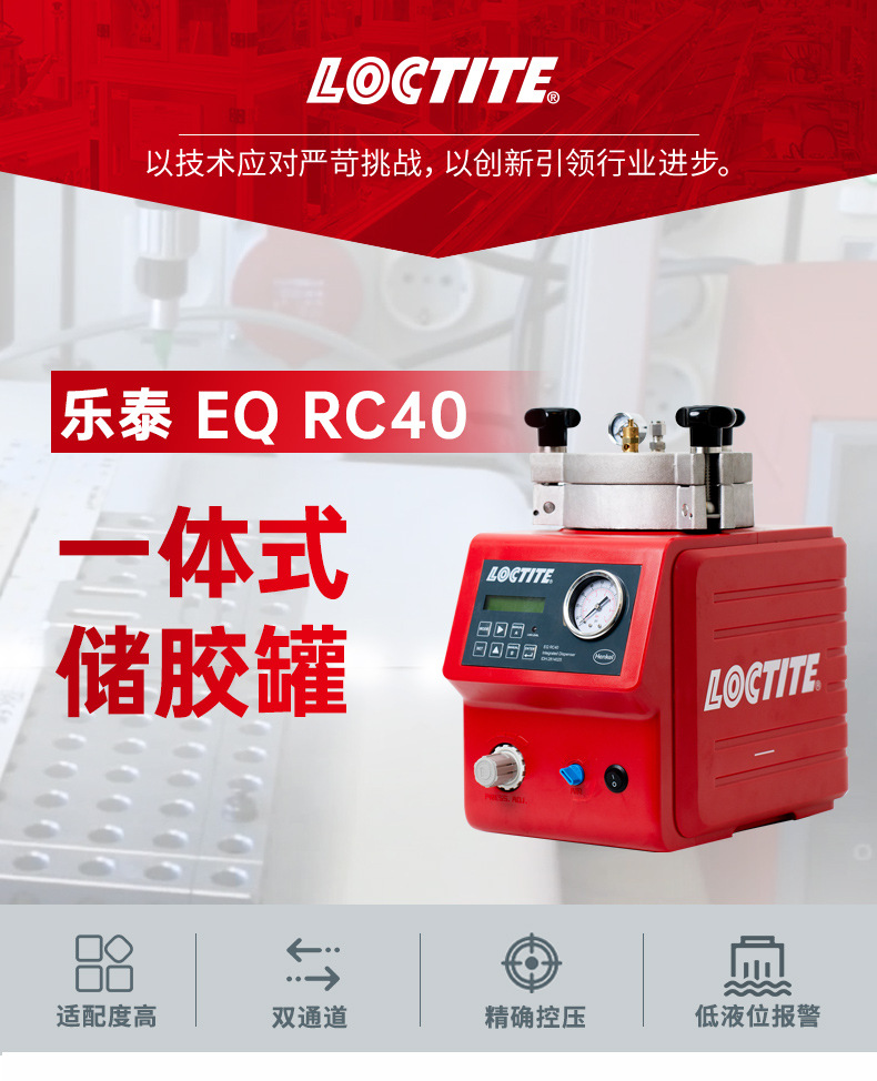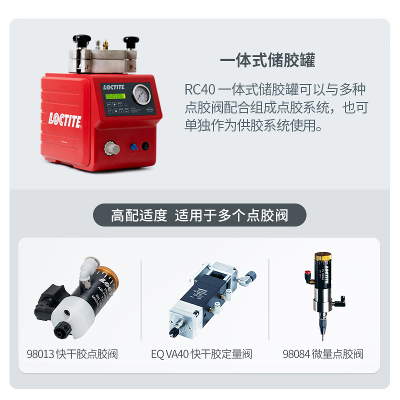 LOCTITE® RC40 集成式半自动点胶器将双通道点胶控制器和点胶存储器组合到一个装置中。其设计允许您独立或同时控制两个输出端 – 无论是点胶阀还是其他任何气动设备。它具备三种操作模式:定时、连续和手动,因此可轻松用于点状或珠状点胶应用。该储胶罐可适配 250 ml (8.4 oz)、200 g (7 oz)、500 g (17.6 oz)、1 升 (35 oz) 和 2 kg (4.4 lb) 包装规格的粘合剂。