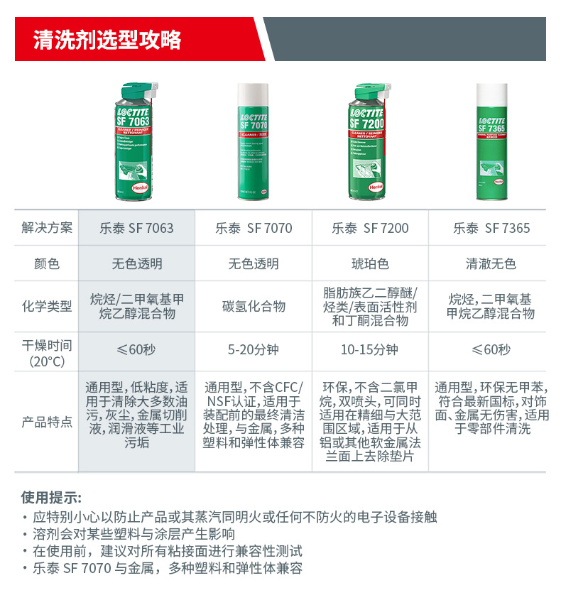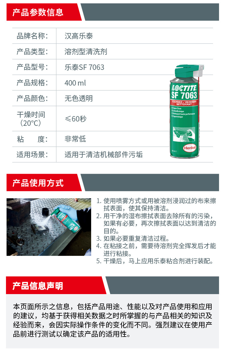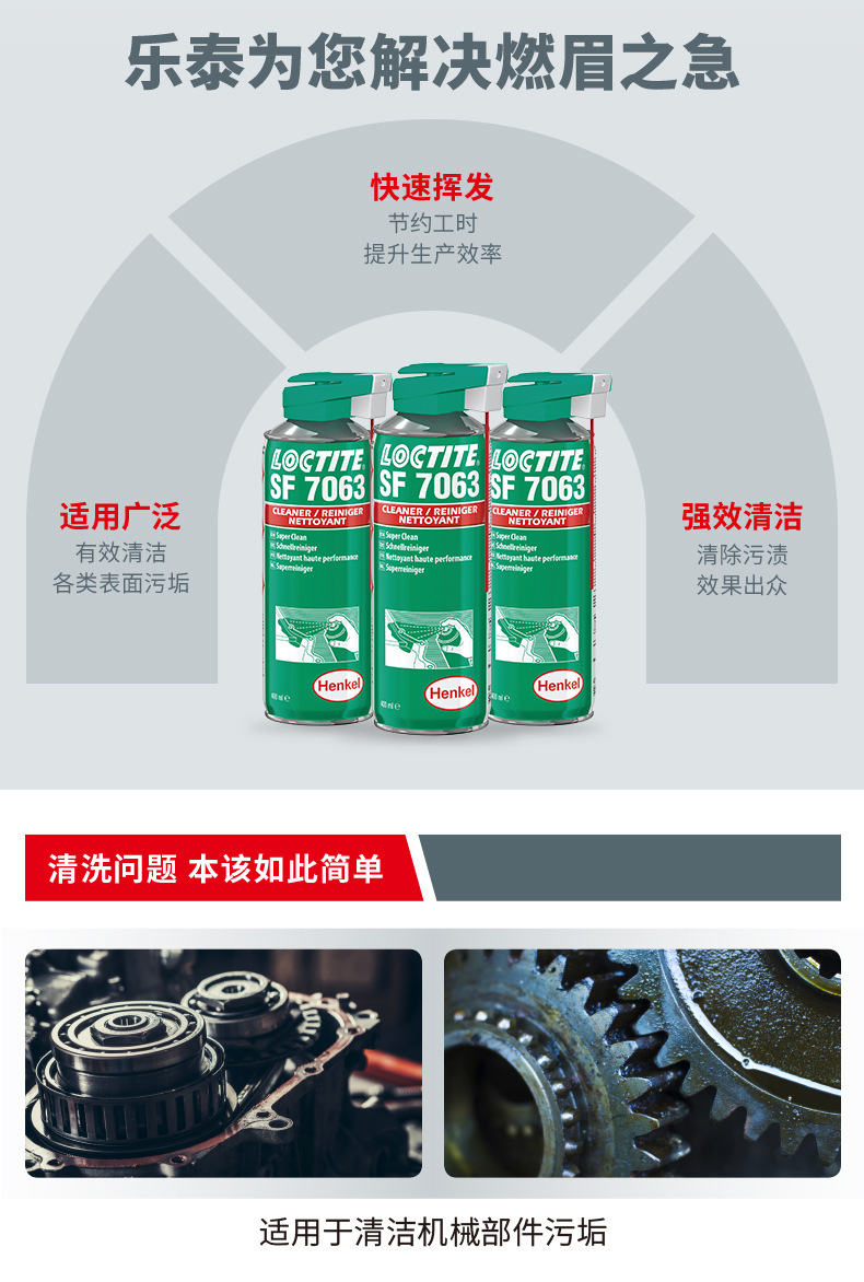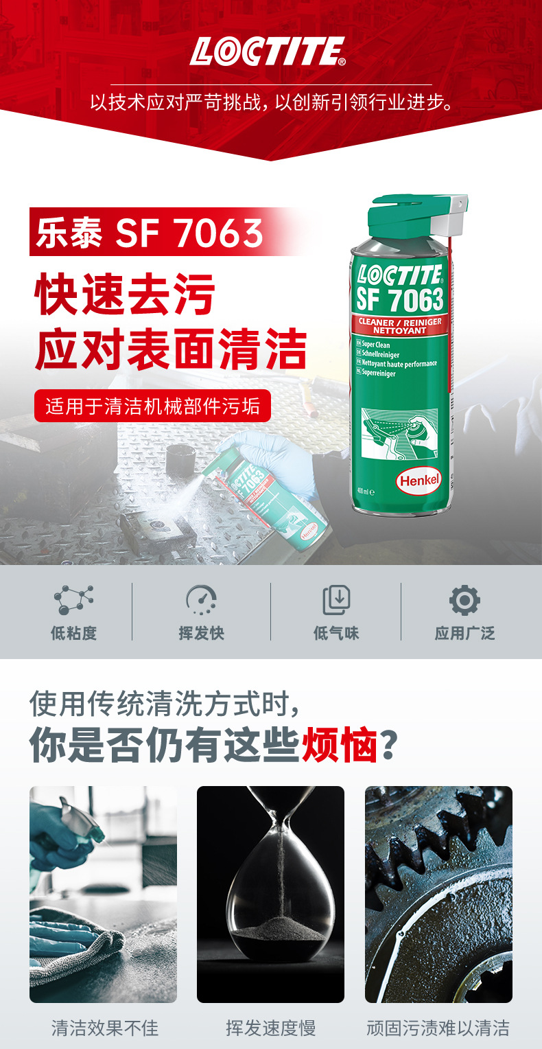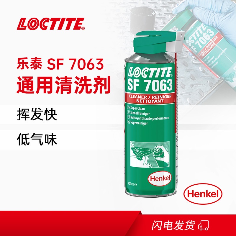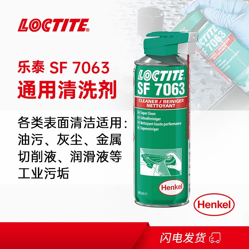 LOCTITE® SF 7063 是一款无色的溶剂基(包括异构石蜡烃、二甲氧基甲烷和乙醇)清洗剂,适用于组装零件前对表面进行清洁和脱脂。本产品设计用于在粘合前有效清除基材上的油脂、油污、润滑液、金属切屑和细粉。也适用于维护操作期间机器部件的清洁和脱脂。