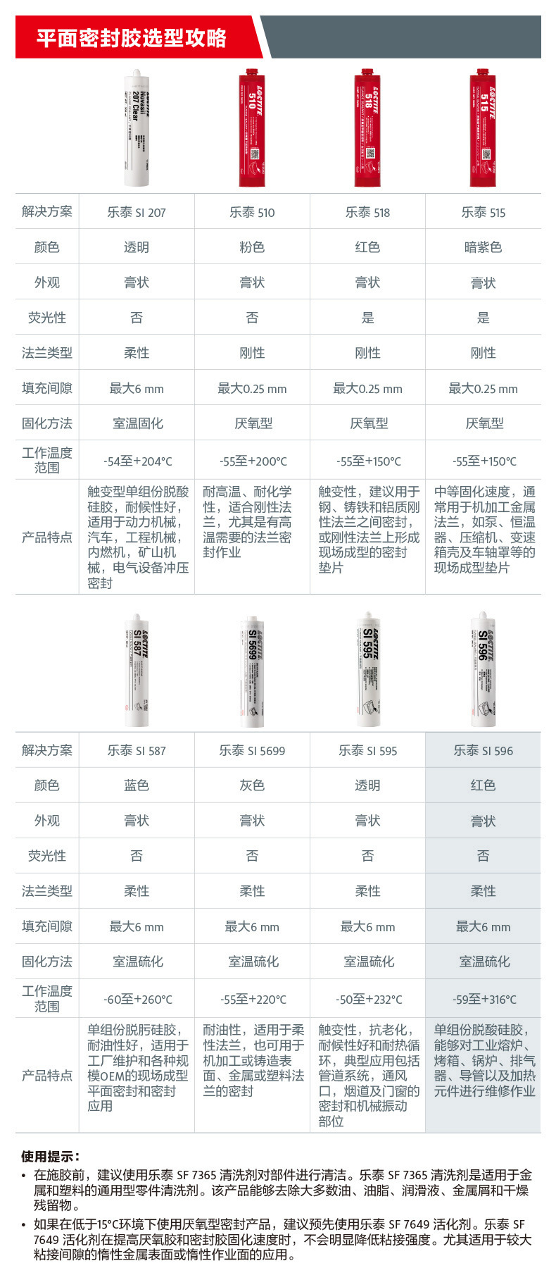 乐泰SI5926•多重作用的灵活树脂密封胶,可被用于金属、塑料或涂料部件的密封•抗震性强,低热延展性和抗收缩性乐泰SI5699•适用于各种类型的法兰密封,包括需要抗水-乙二醇性的冲压金属片•10分钟以后不剥落