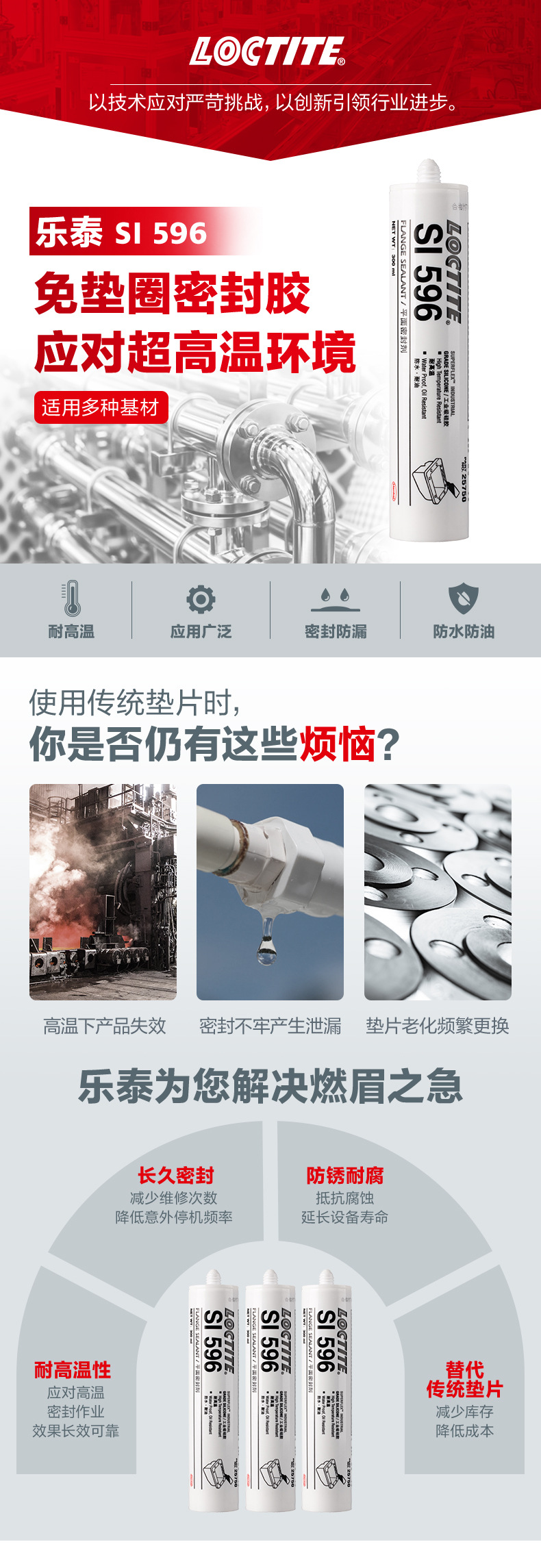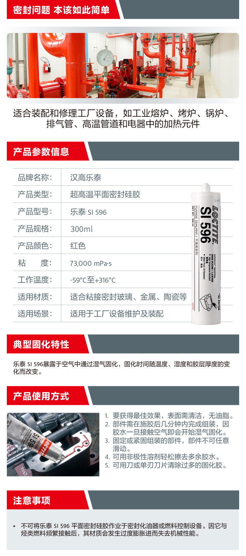 乐泰SI 596接触空气中的水分会固化,形成一层牢固柔韧、防水耐油的硅胶粘合剂。本产品可耐受高达 316°C (600°F) 的温度,非常适合用于工业炉、烤箱、锅炉、排气管、高温管道及电器加热元件的密封应用。它具有抗老化、耐候及抗热循环性能,不会硬化、收缩或开裂。填充法兰表面所有不平之处、实现防漏密封。肟硅胶不会腐蚀法兰表面,这不同于常见的乙酰氧基室温硫化密封胶。消除垫圈压缩形变。降低库存成本和复杂性,因为一管密封胶可制成很多形状尺寸各异的垫圈。实现瞬时密封。