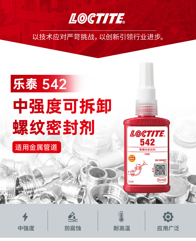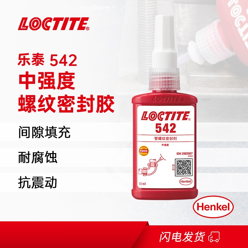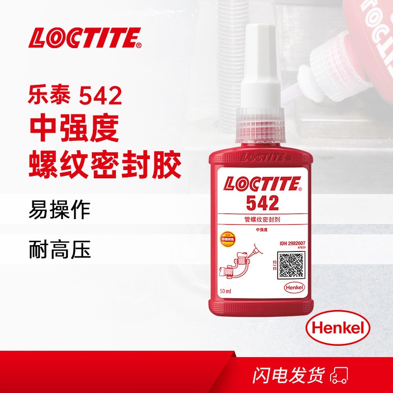 乐泰542设计用于金属管道和接头以及其它圆柱形金属组件的锁固和密封。该产品密闭在隔绝空气的环境中时,可在紧密配合的金属表面间固化,防止冲击和振动引起的松动和泄漏。乐泰542具有触变性,涂覆到部件上后,可减少液体产品的移动。