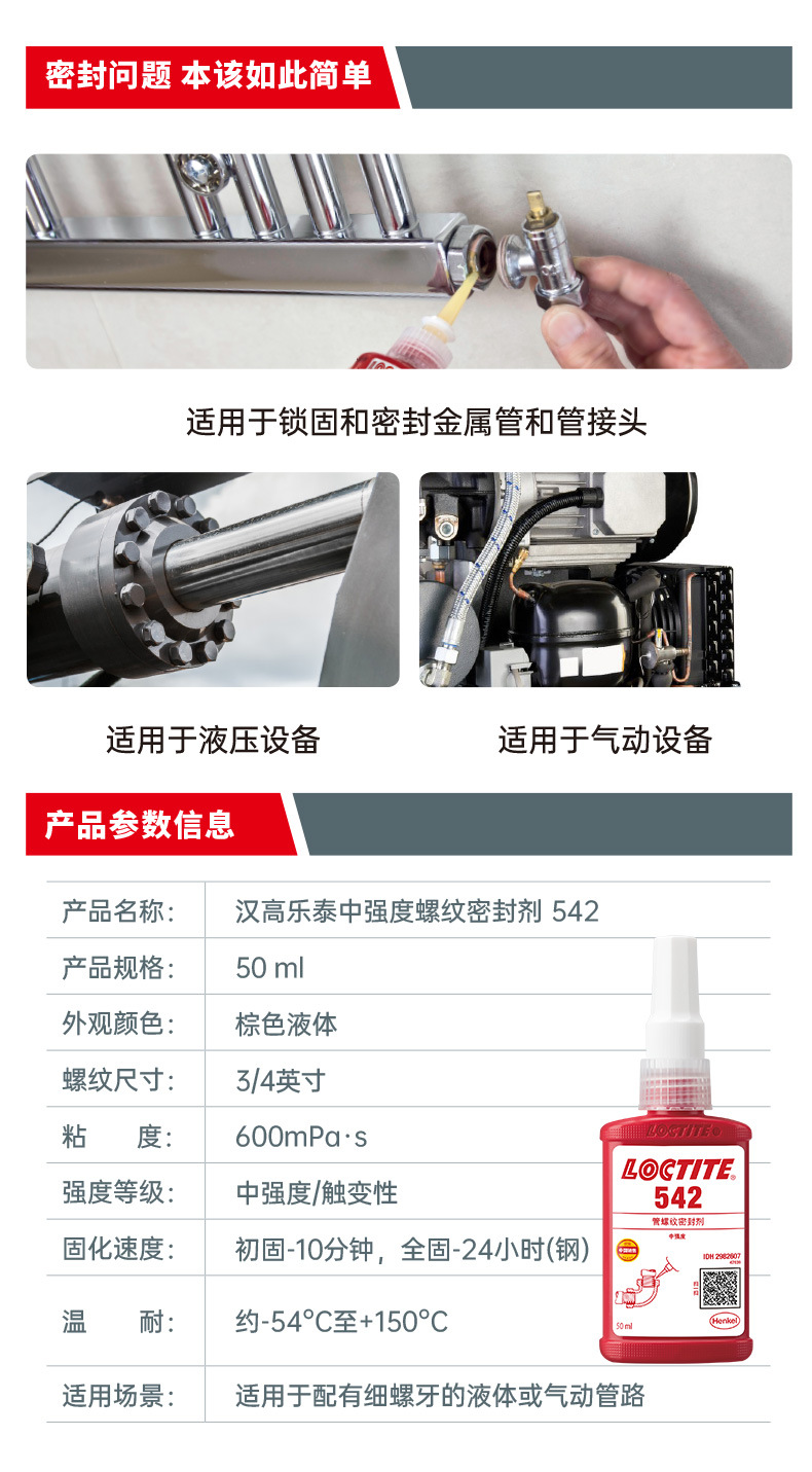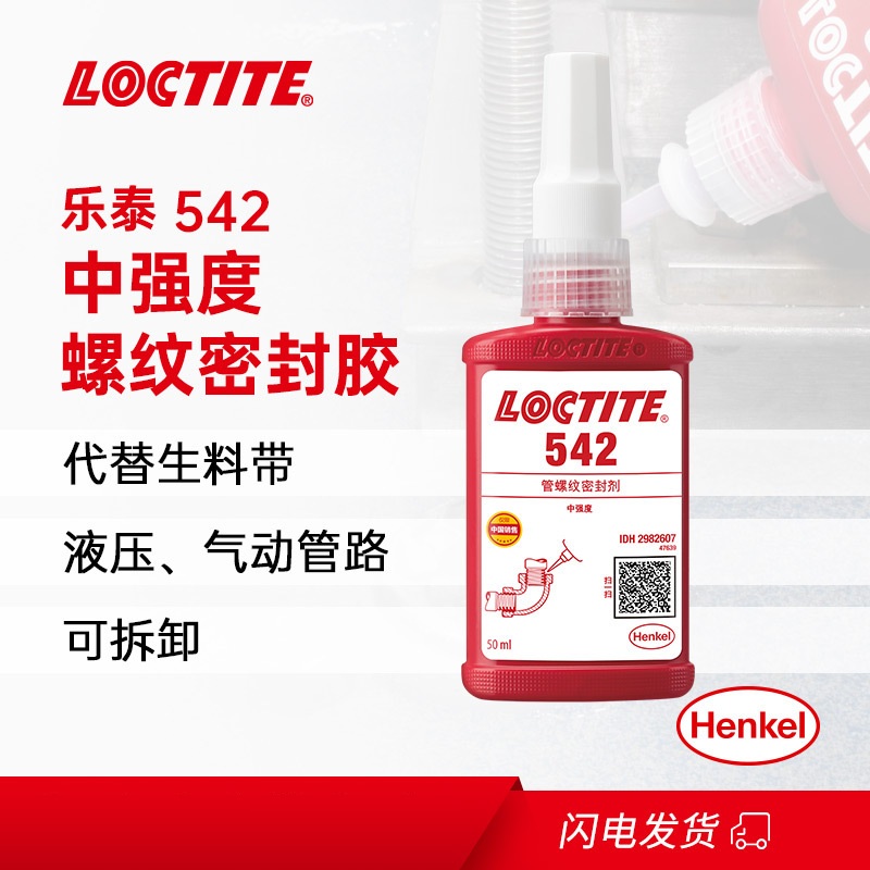 这是一款单组分、中等强度的快速固化螺纹密封胶,专门用于对液压和气动管路系统中常用的细牙金属管道与配件进行锁固和密封。适用于流体过滤系统。