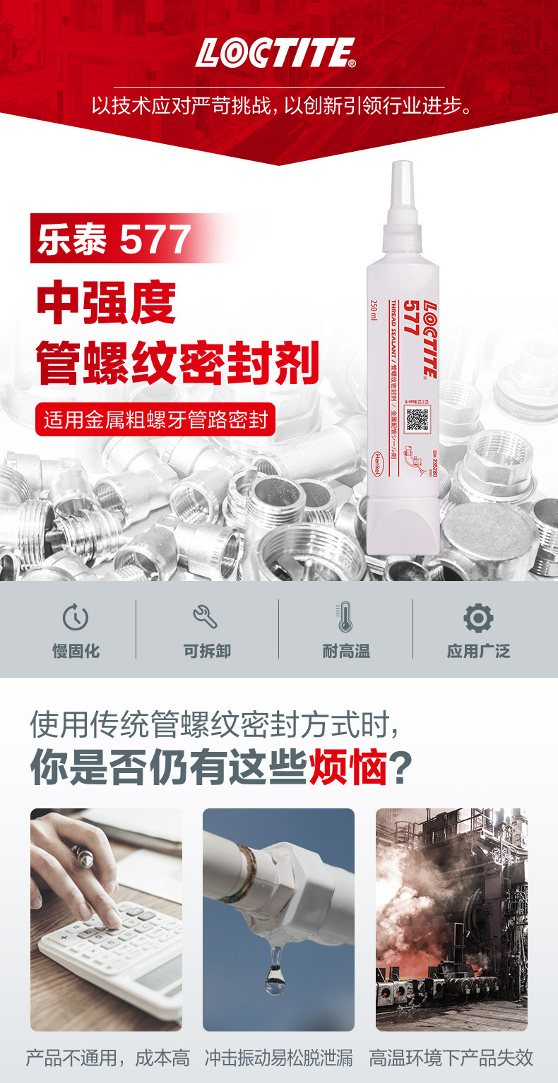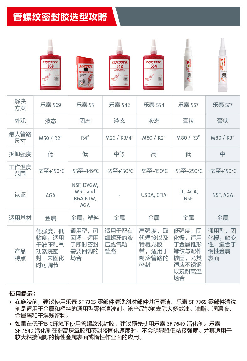 乐泰577; •用于粗牙螺纹部件上的通用密封•适用于需要低温的环境,例如室外器械维护乐泰55•通用密封——螺纹管和设备密封剂•快速、简单、可靠的全压密封•适用于塑料和金属螺纹表面应用