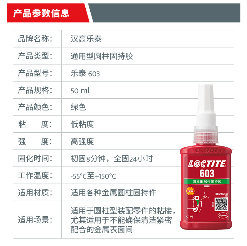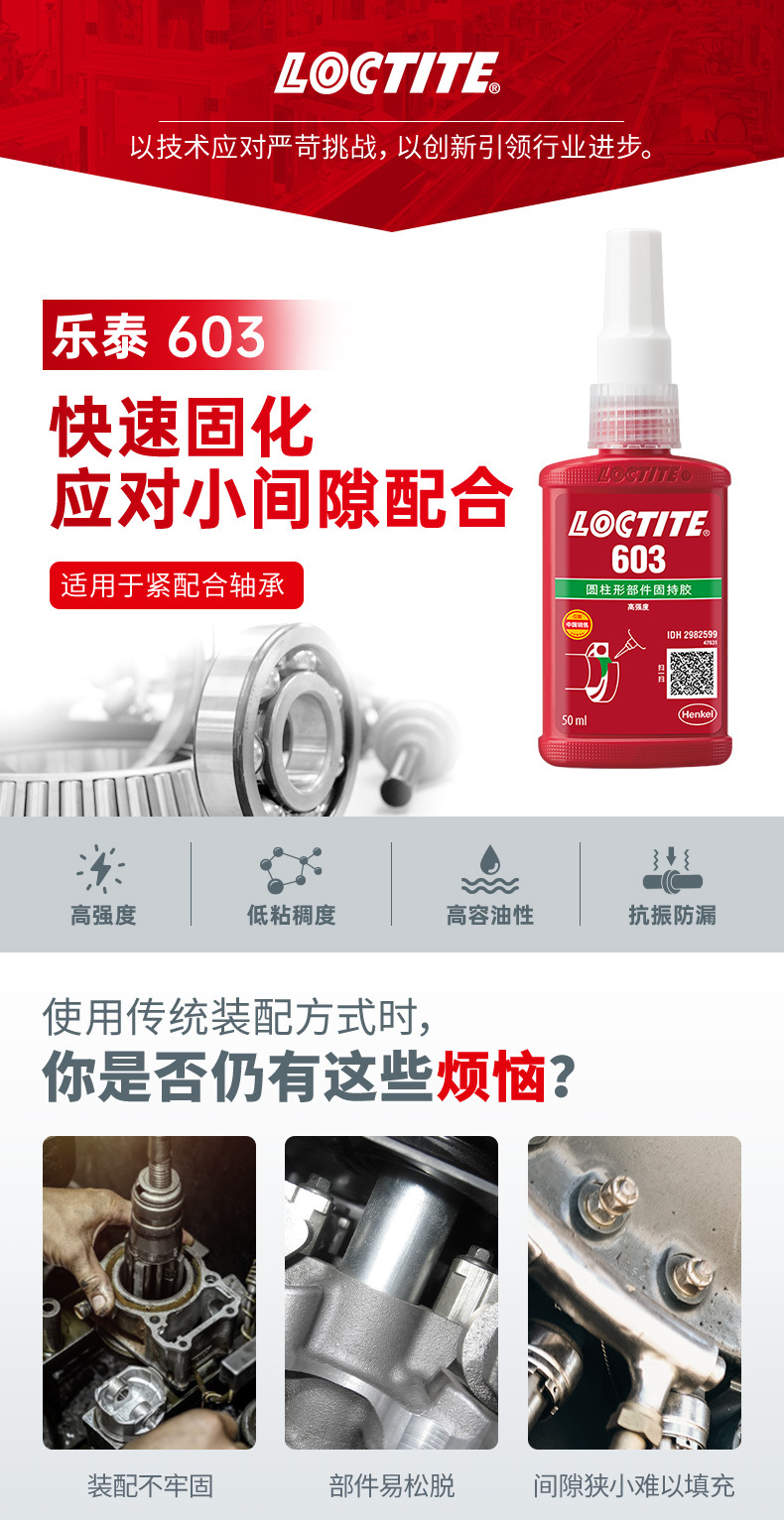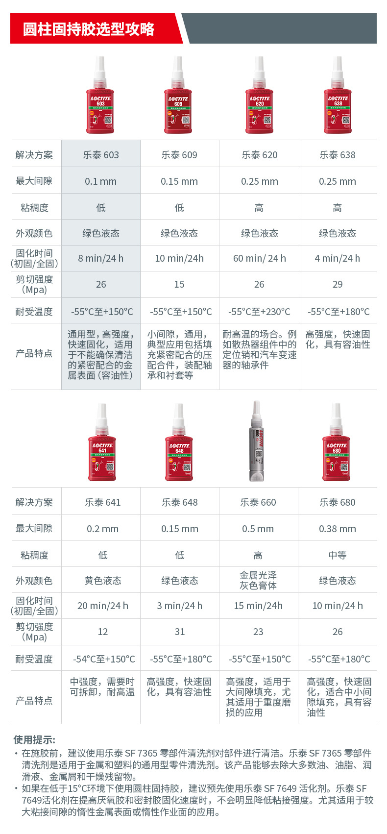 耐高温性:大多数乐泰固持胶能够承受高达150°C的温度。对于需要耐受更高温度的应用,汉高已经研发出一种特殊的固持胶系列,例如乐泰668和乐泰620。粘结强度:对于需要永久粘结的应用,建议使用高强度固持胶。如果部件需要分离进行维护,则最好使用剪切强度较低的中等强度的产品。固化速度:我们的乐泰固持胶系列可提供大量固化速度选择。许多生产应用需要固持胶具有快速固化能力来优化生产率。另一方面,一些应用要求较低的固化速度,使得在部件组装后可以作出调整。