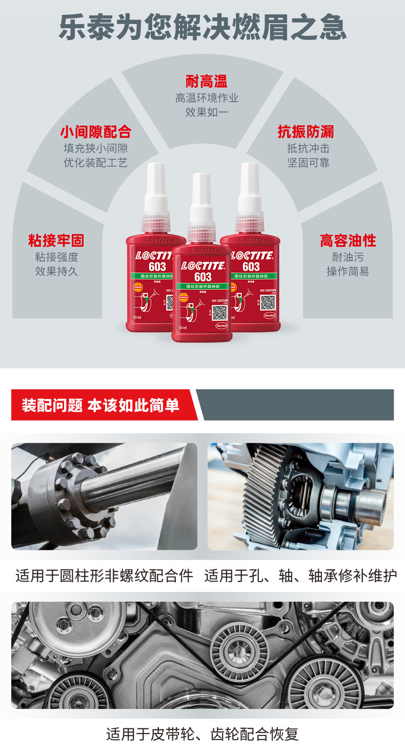 这是一款单组分固持胶,专为粘合轴承、衬套和轴等圆柱形配合零件而设计。