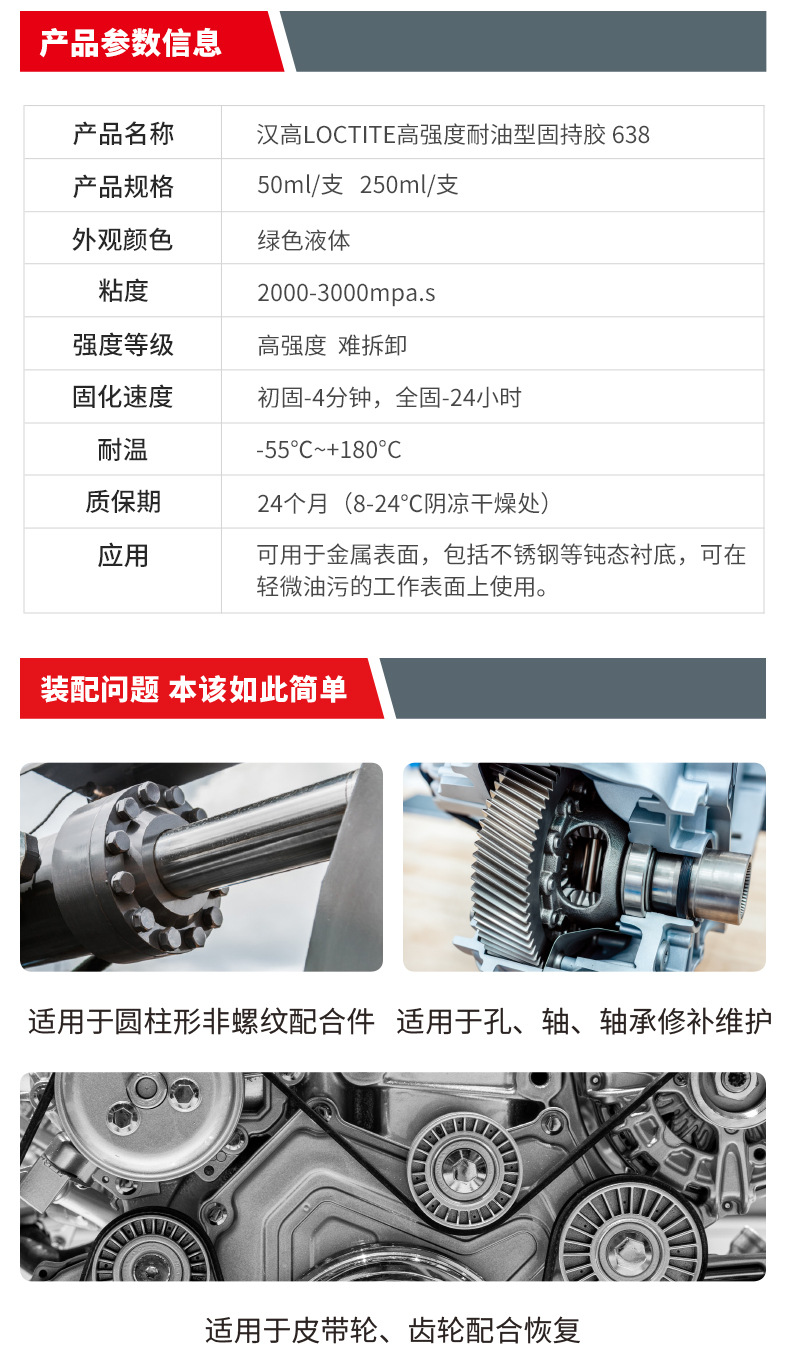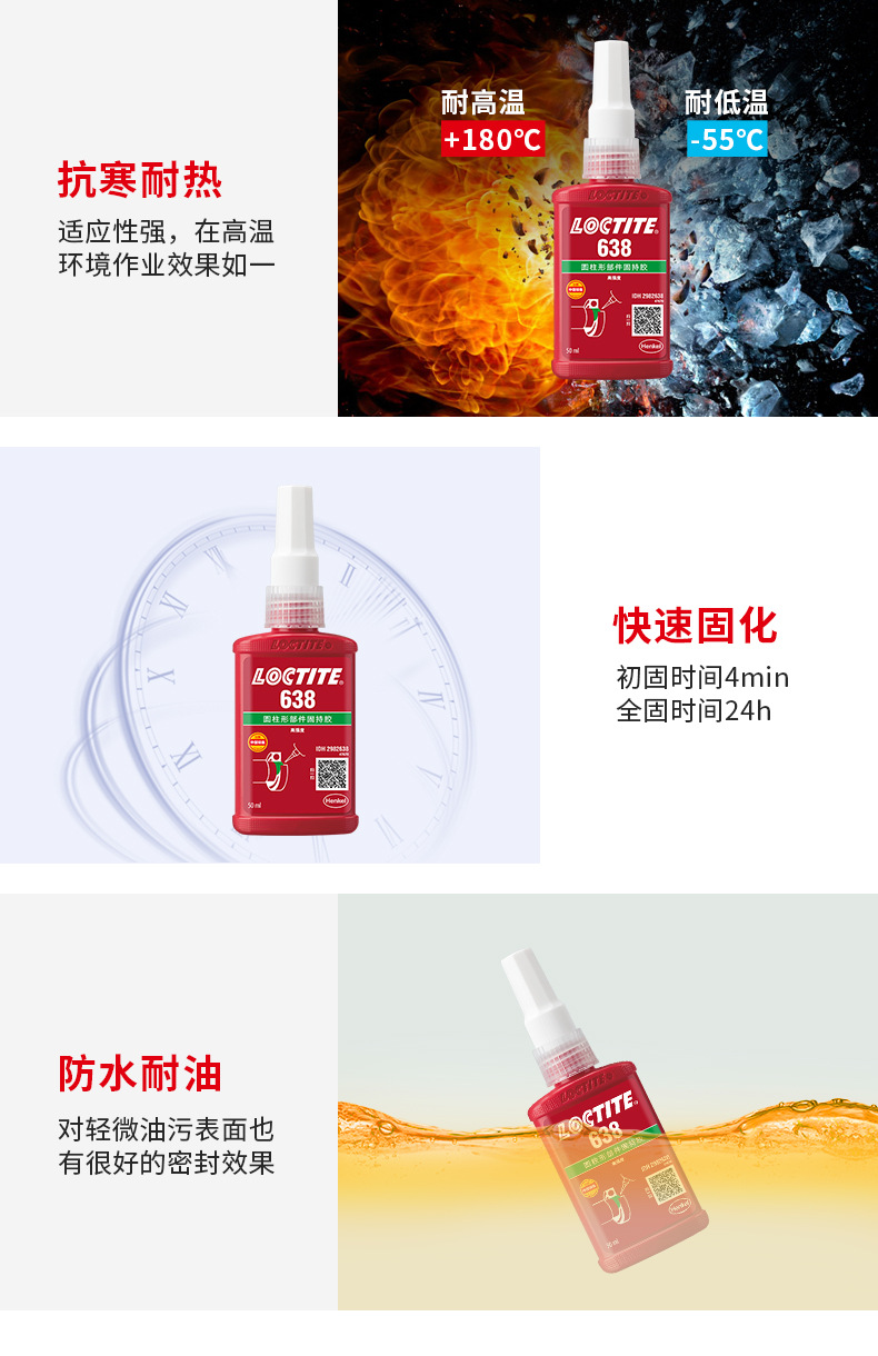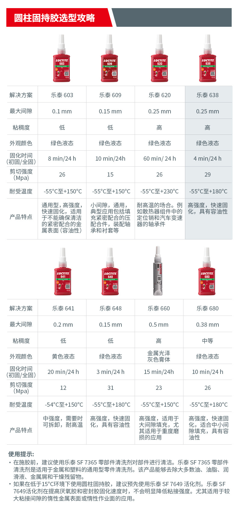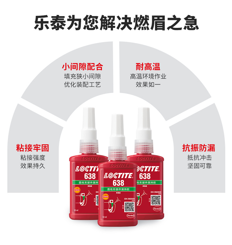 耐高温性:大多数乐泰固持胶能够承受高达150°C的温度。对于需要耐受更高温度的应用,汉高已经研发出一种特殊的固持胶系列,例如乐泰668和乐泰620。粘结强度:对于需要永久粘结的应用,建议使用高强度固持胶。如果部件需要分离进行维护,则最好使用剪切强度较低的中等强度的产品。固化速度:我们的乐泰固持胶系列可提供大量固化速度选择。许多生产应用需要固持胶具有快速固化能力来优化生产率。另一方面,一些应用要求较低的固化速度,使得在部件组装后可以作出调整。