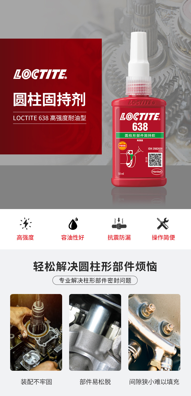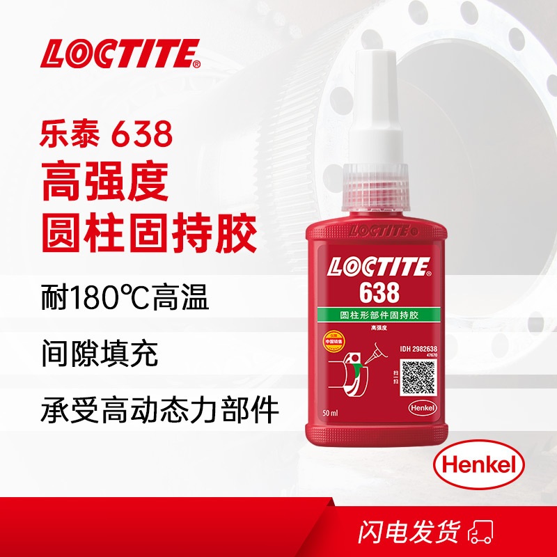 如果需要适合所有金属(包括惰性基材)的高强度固持胶,请选择 LOCTITE® 638。此产品具有出色的耐高温和耐油性能,固定时间仅为四分钟,可填充 0.15 mm 至 0.25 mm(0.006″ 至 0.01″)的间隙。乐泰638适用于间隙配合,对于轴向的载荷有很好的传递作用。具有极佳的耐动态载荷、轴向载荷、径向载荷性能。作为一款耐受轻微表面污染的产品,它无需使用活化剂,即可在惰性金属表面固化。此产品粘度很高,非常适合粘合轴、齿轮、滑轮和类似的圆柱形部件,也可用于高强度螺纹锁固和螺纹密封。操作温度为 -55°C 至 180°C(-65°F 至 355°F)。