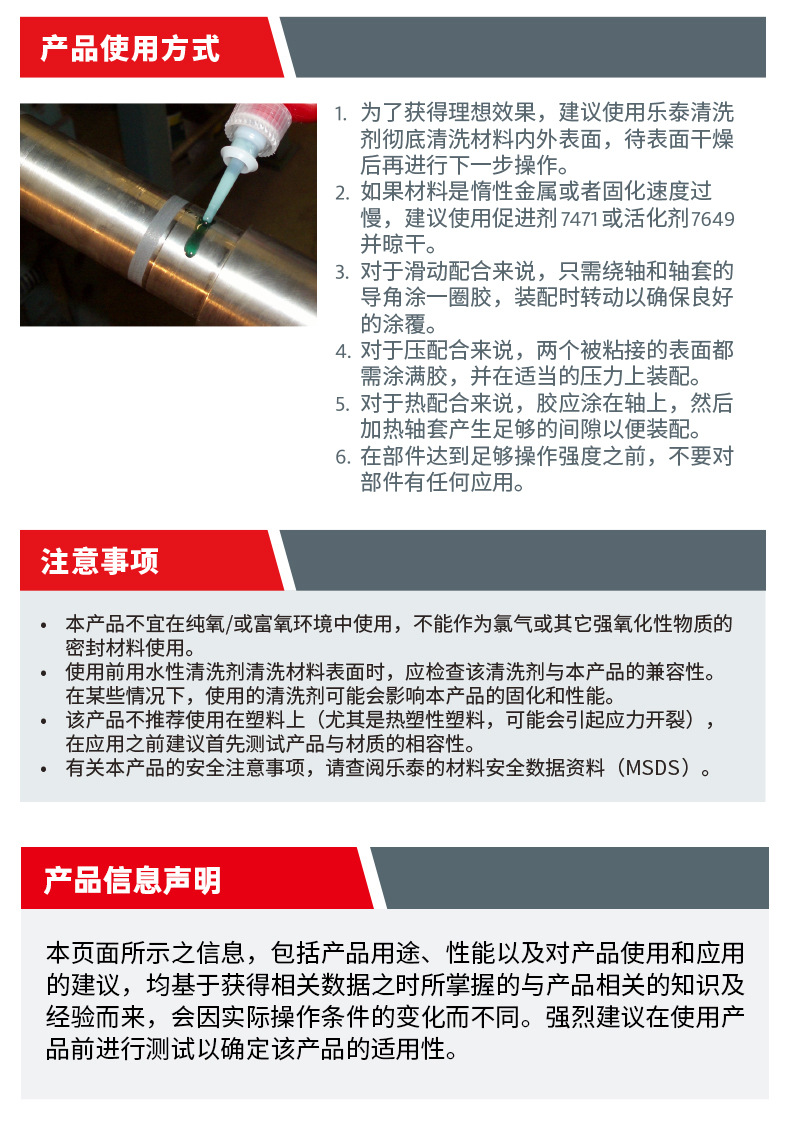 乐泰固持胶属于厌氧胶,可以将轴承、轴套和圆柱形部件固定到外壳内或轴上。它们可达到最大的负载传输能力和均匀的应力分布,并且可消除微动腐蚀。以液体涂敷,在匹配的金属表面之间形成100%接触,免除了对昂贵零部件、耗时加工或使用机械方法的需要。乐泰固持胶填充零部件之间的空隙,然后固化可形成强大的精密组件。