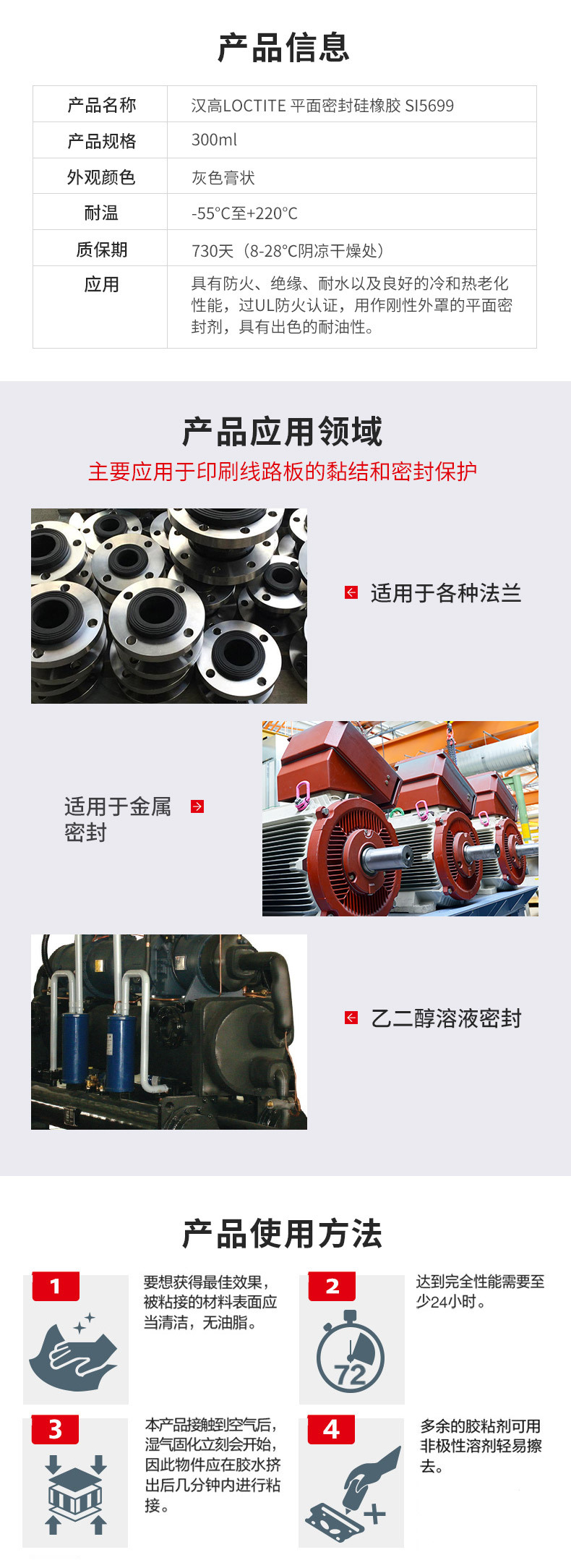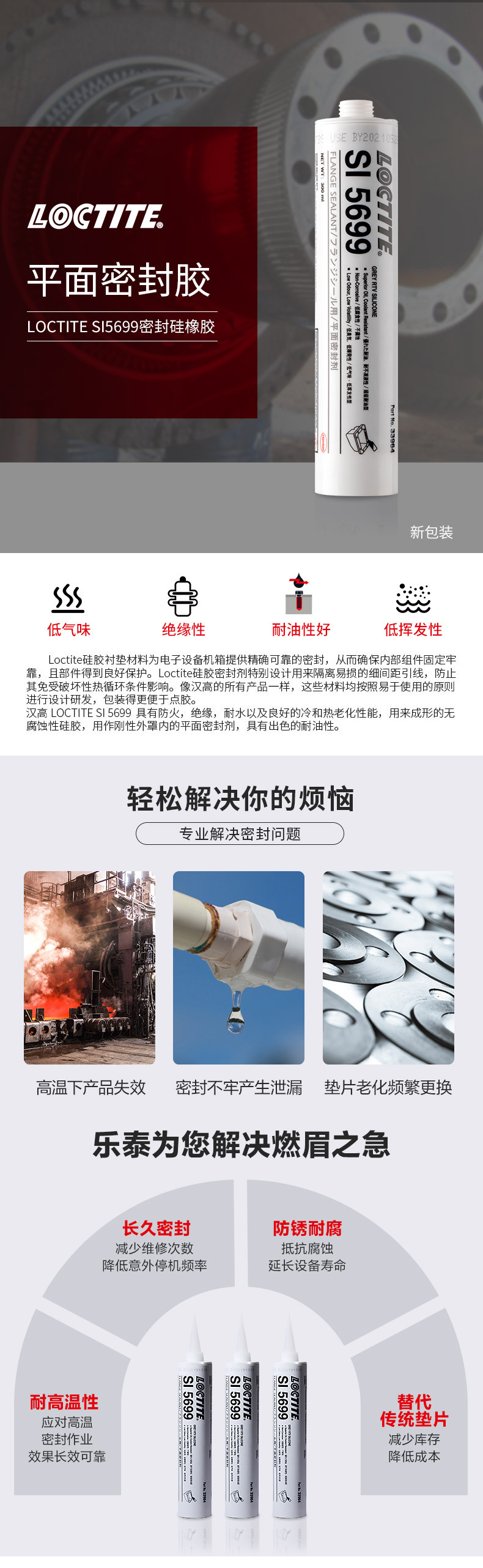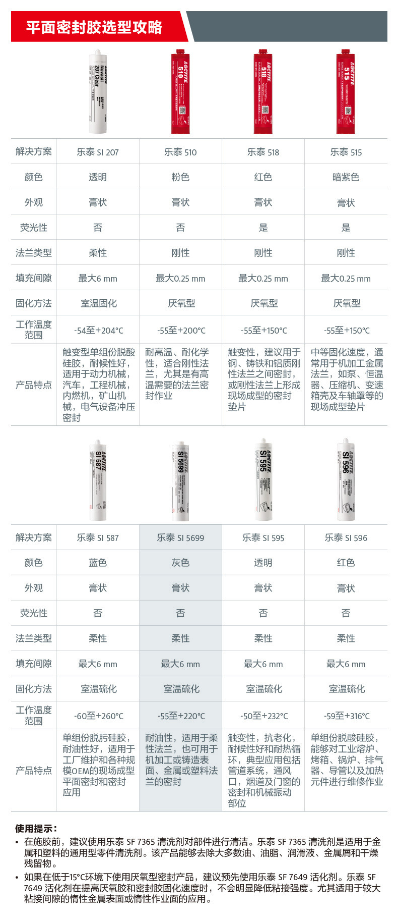 乐泰SI5926•多重作用的灵活树脂密封胶,可被用于金属、塑料或涂料部件的密封•抗震性强,低热延展性和抗收缩性乐泰SI5699•适用于各种类型的法兰密封,包括需要抗水-乙二醇性的冲压金属片•10分钟以后不剥落
