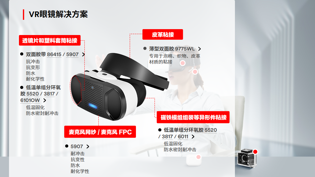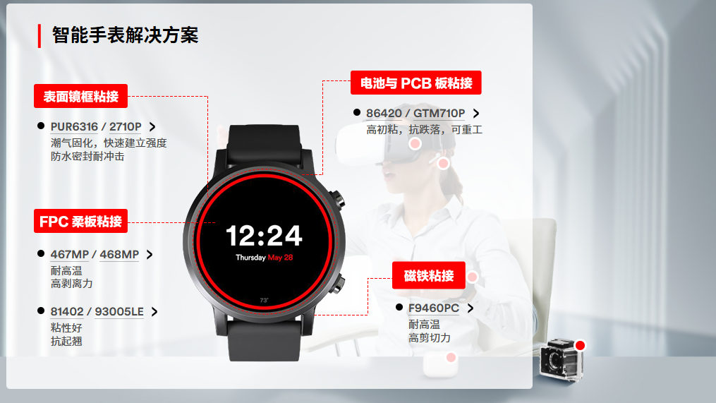胶粘产品为智能穿戴设备提供粘接方案,包含小屏幕粘接,小部件粘接, 电池粘接、异型件粘接,FPC柔性电路板粘接,防水密封粘接等等。在智能手表,智能手环, AR(增强现实)/VR (虚拟实境)设备, 运动相机,无线耳机, TWS等中广泛使用。