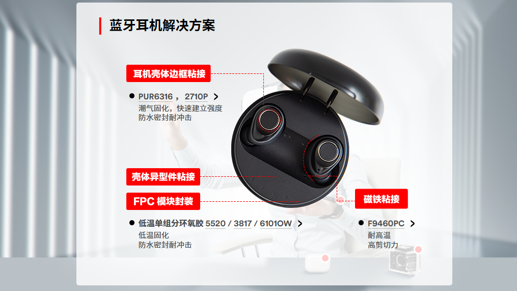覆盖耳机壳粘接、喇叭 / 麦克风固定、电池封装、FPC、防尘网、耳塞亲肤粘接