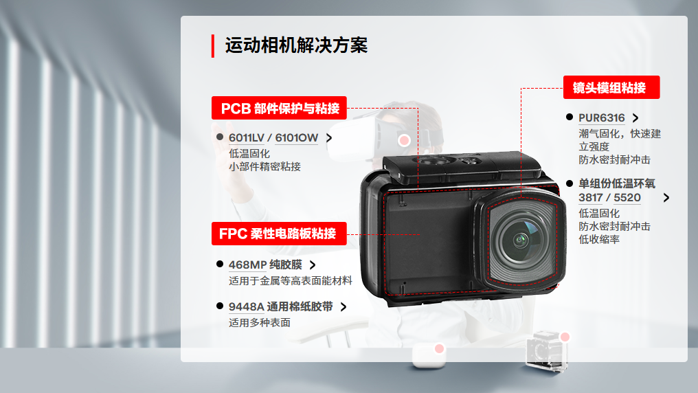 - 核心能力:IP68 级防水、抗跌落冲击、超薄粘接、曲面贴合、耐汗耐化学、皮肤低敏、低温固化、可重工