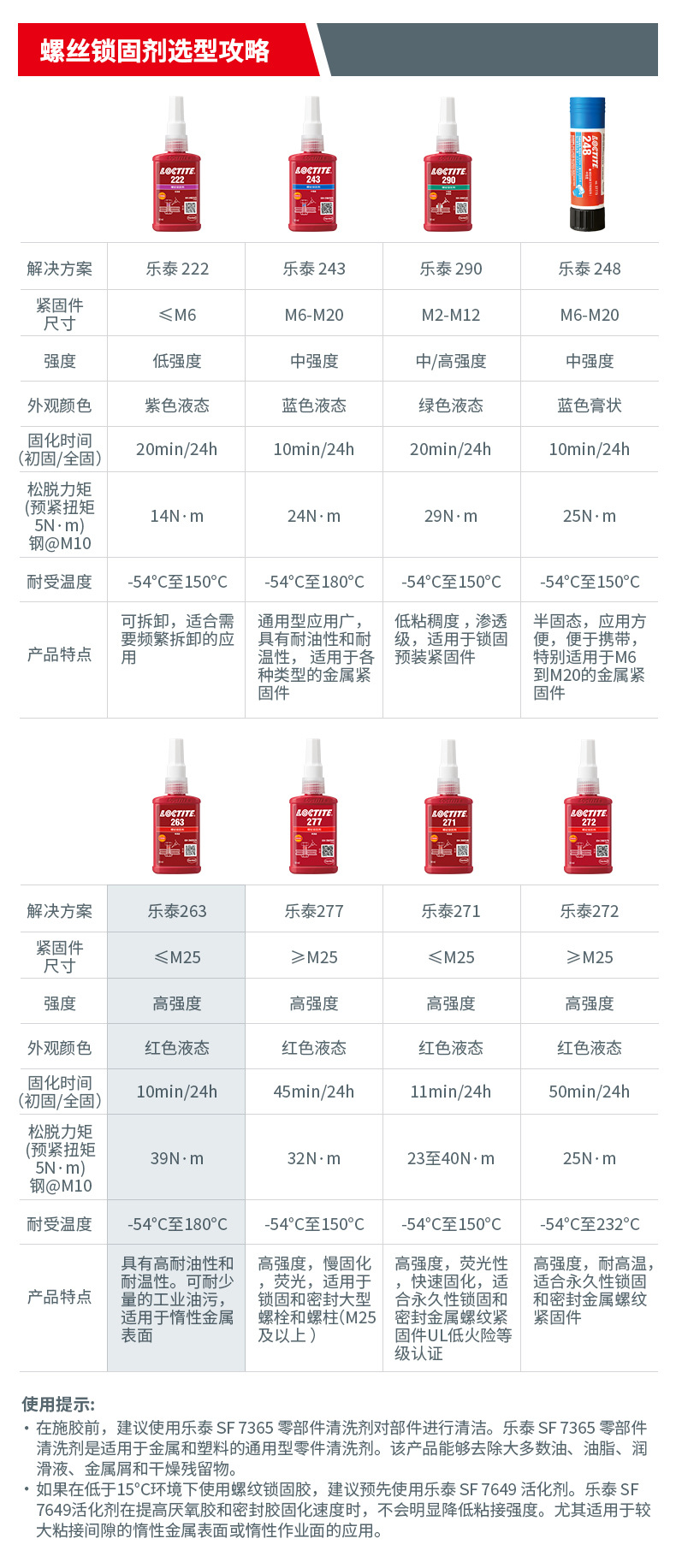 从乐泰丰富的产品系列中选择正确的螺纹锁固剂的主要准则包括:材料(塑料或金属)、使用的螺钉或螺栓的直径和螺纹长度、及其强度等级。许多乐泰产品可普遍适用于各种螺纹尺寸。低强度:可用标准的手工工具移除。适用于可调整、标准化的螺丝、测量仪器等(螺纹大小:≤M80)中强度:可用手工工具移除,但会比较难以拆卸。适用于机械工具、压力机、泵、压气机、装配螺栓、齿轮箱(螺纹大小:≤M80)高强度:用标准的手工工具非常难拆卸;可能需要加温来移除。适用于永久装配,如重型运输、壁骨、发动机、喷吸泵等(螺纹大小:≤M80)