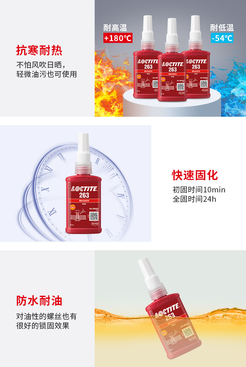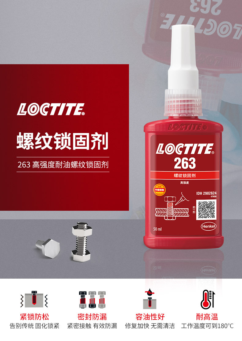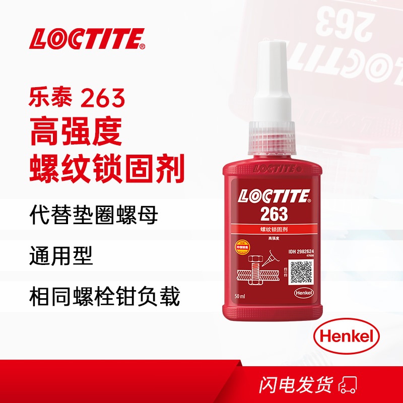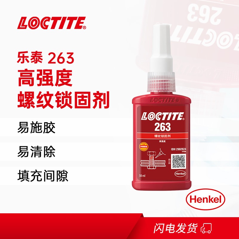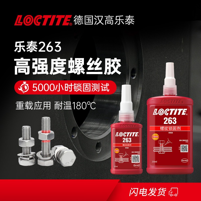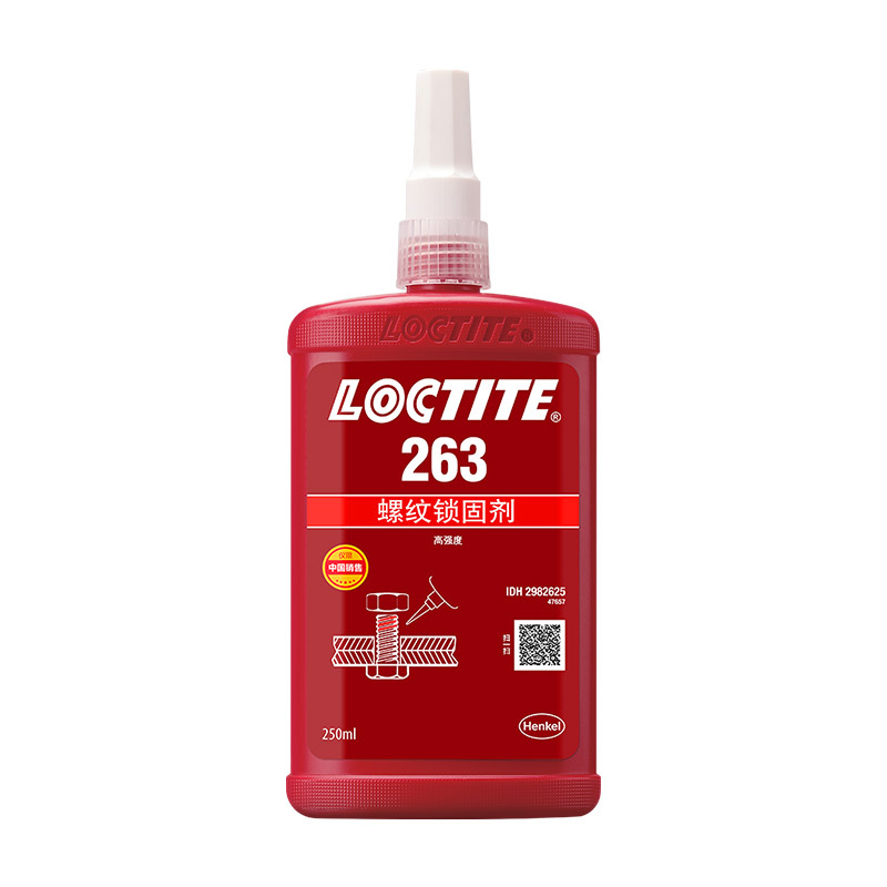 乐泰263是一款红色耐油型高强度螺纹锁固剂,具有优秀的耐高温性能,可以应用在包括惰性金属的所有金属基材上,例如:不锈钢、铝合金、电镀处理过的材料和无铬涂层。用于螺纹紧固件的永久锁固和密封。它尤其适合螺柱拧入电机外壳等需要高强度的重型应用,是引擎室或泵仓体的理想永久性锁固材料。 拆卸时需要局部加热。