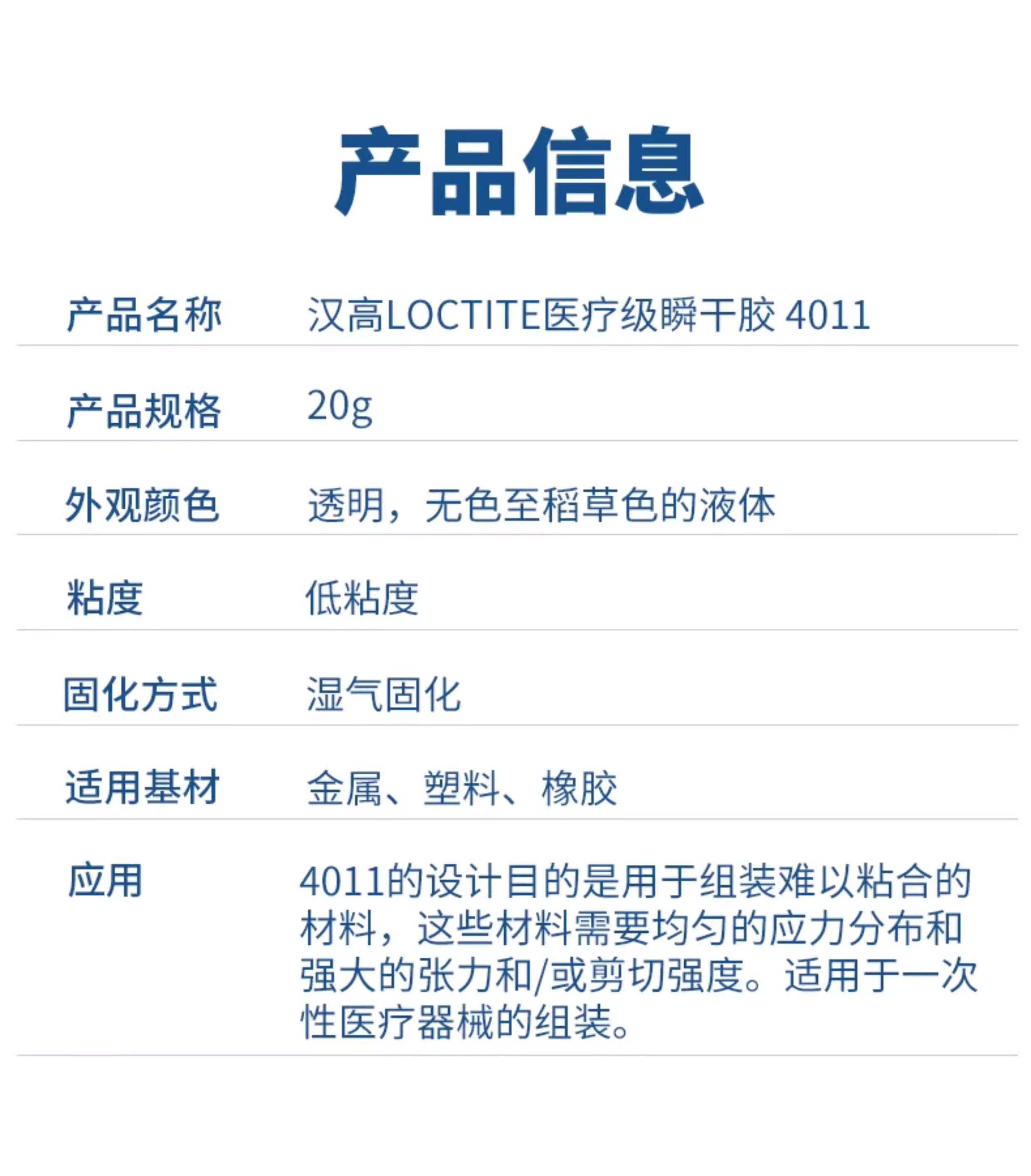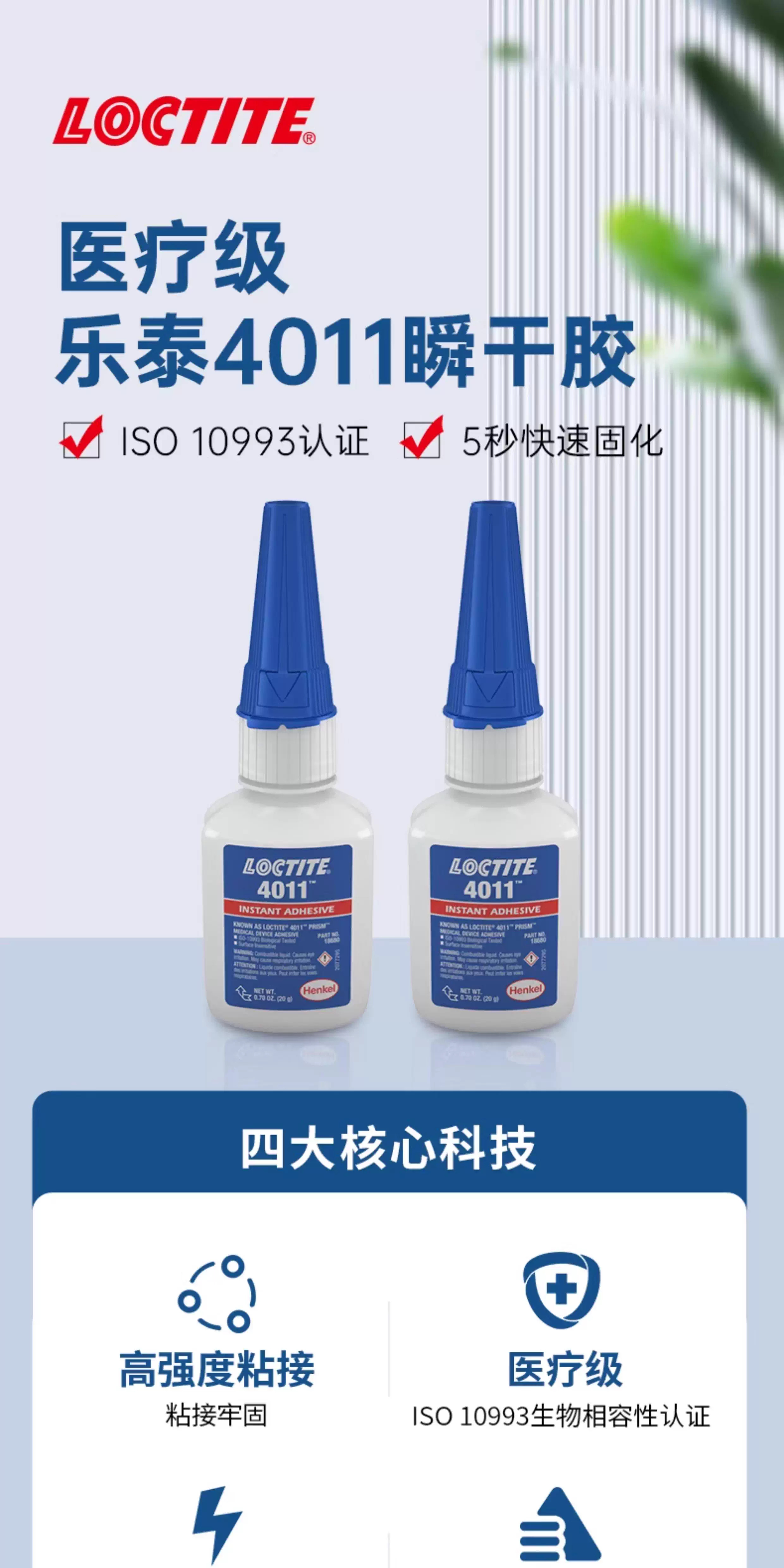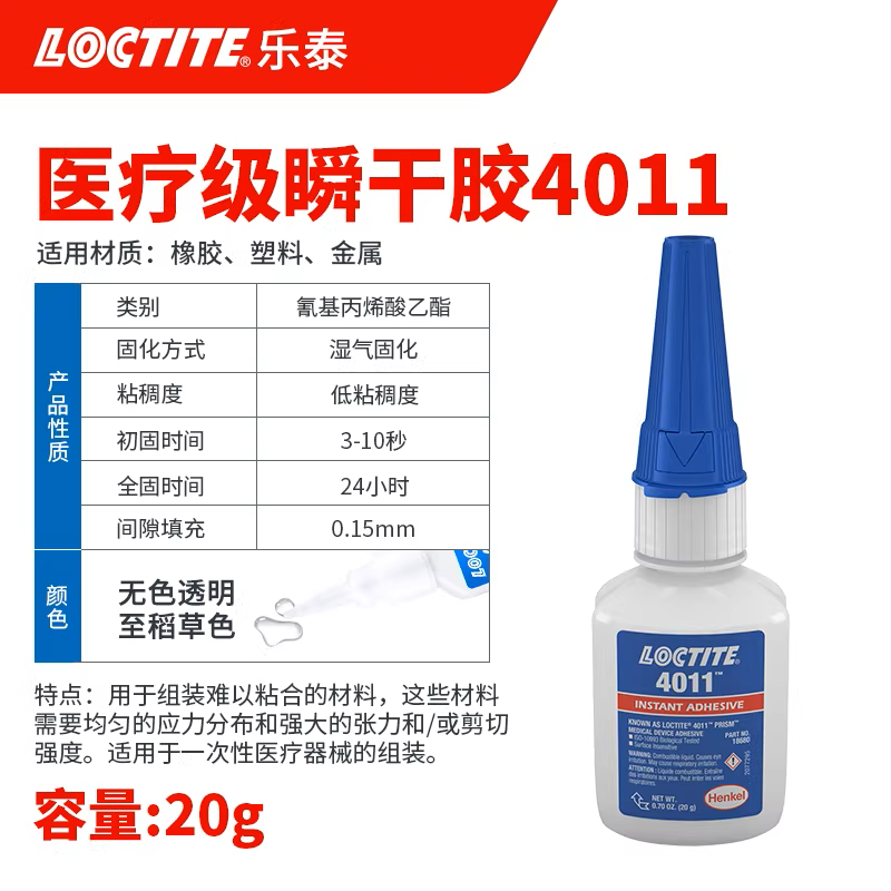 这是一款单组分、对表面不敏感的快速固定瞬干胶,适用于一次性医疗器械组装。对多孔或吸水性材料具有优异的粘合效果。