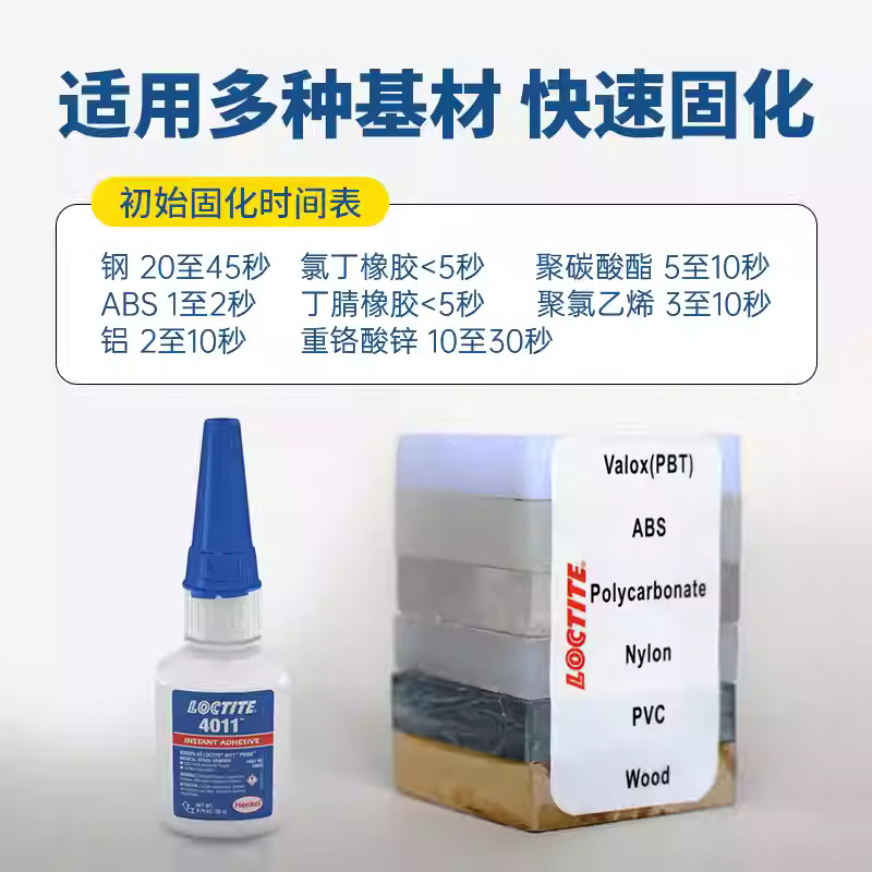LOCTITE® 4011 是一款快速固定的瞬干胶,专为需要在均匀应力分布和高拉伸/或剪切强度的多种材料组装而设计。使用底漆 LOCTITE® SF 7701,可实现难粘材料(PP、PE、PTFE)的组装。此外,它也适用于粘合木材、纸张、皮革和织物等多孔材料。LOCTITE 4011 已通过汉高 ISO 10993 协议测试,适用于一次性医疗器械。
