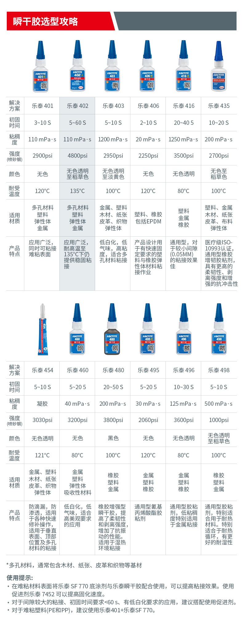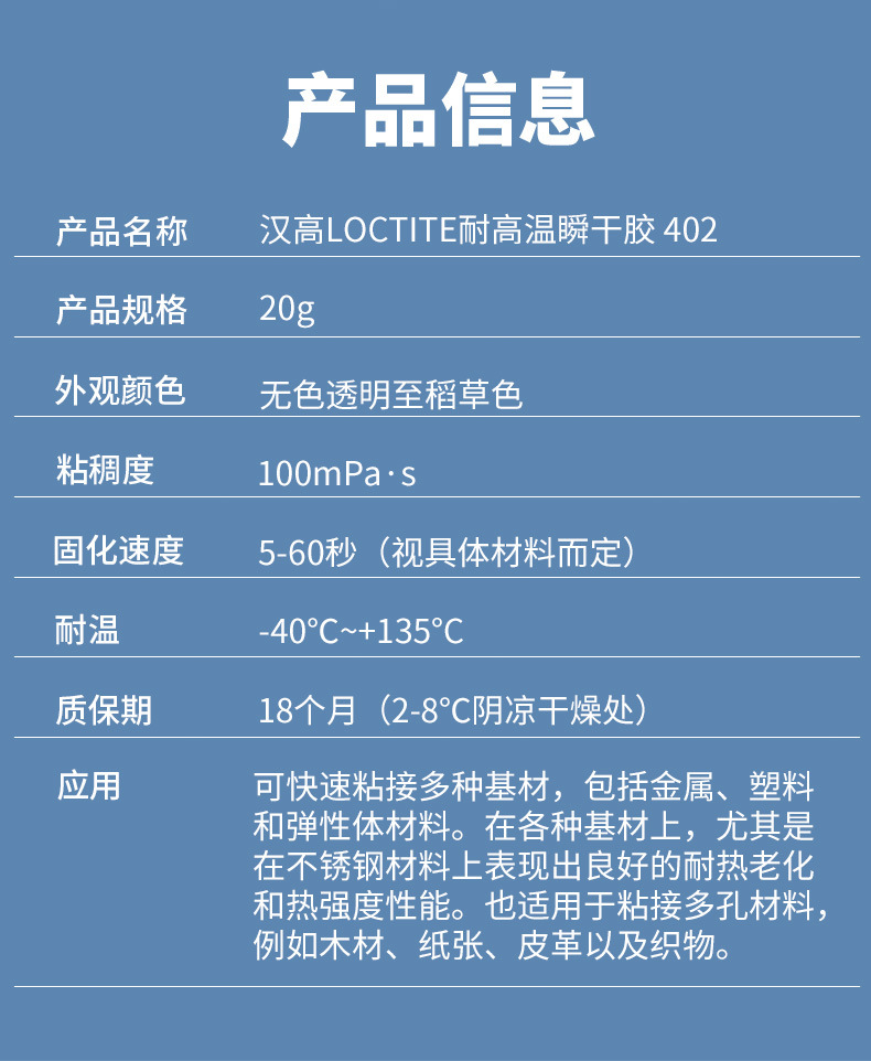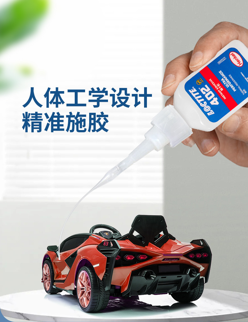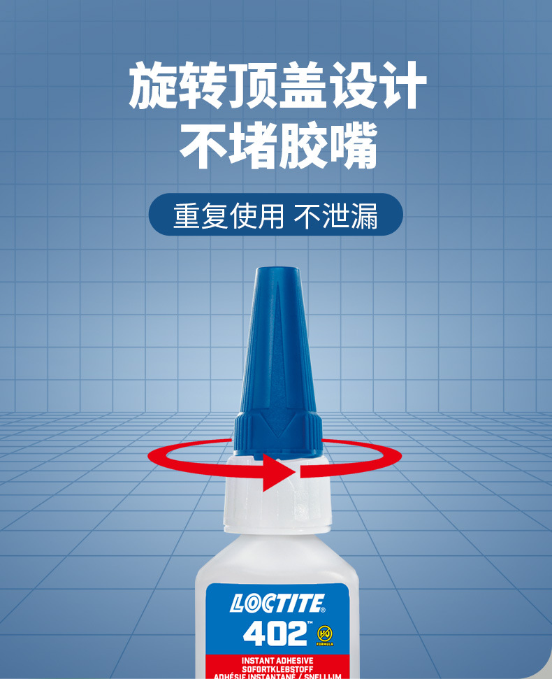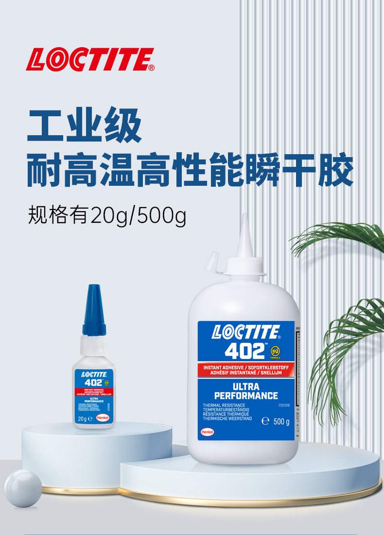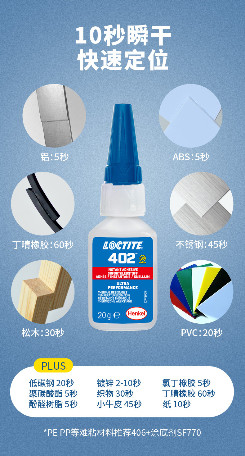 LOCTITE® 402 是一款耐高温快速固定的瞬干胶,能够可靠且牢固地粘合多种塑料、橡胶和金属基材。本产品非常适合在高速生产领域中组装小零件以及进行快速的流动维修工作。使用底涂剂 LOCTITE® SF 770(医疗器械组装时使用 LOCTITE® SF 7701),可以对难粘材料(PP、PE、PTFE)进行组装。
