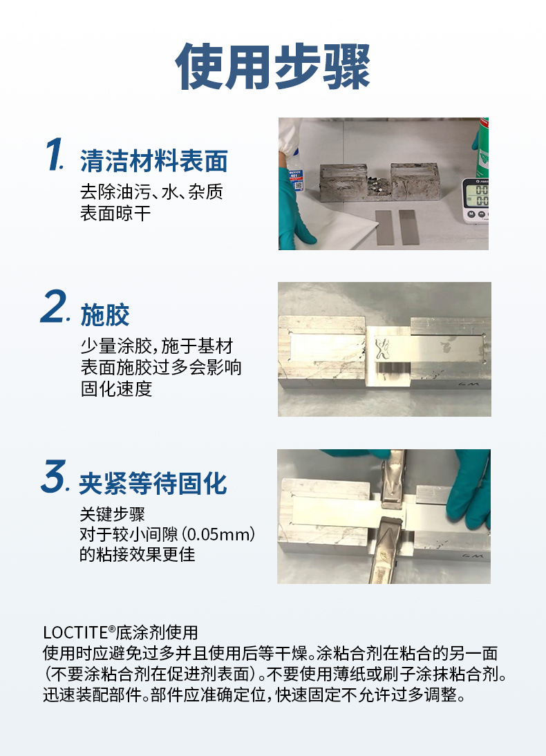 - 使用 LOCTITE SF 770 或 SF 7701 底涂剂组装难粘材料
