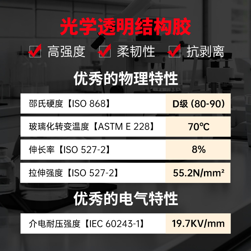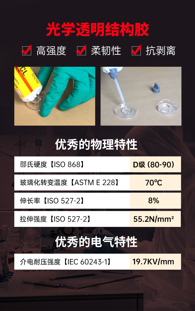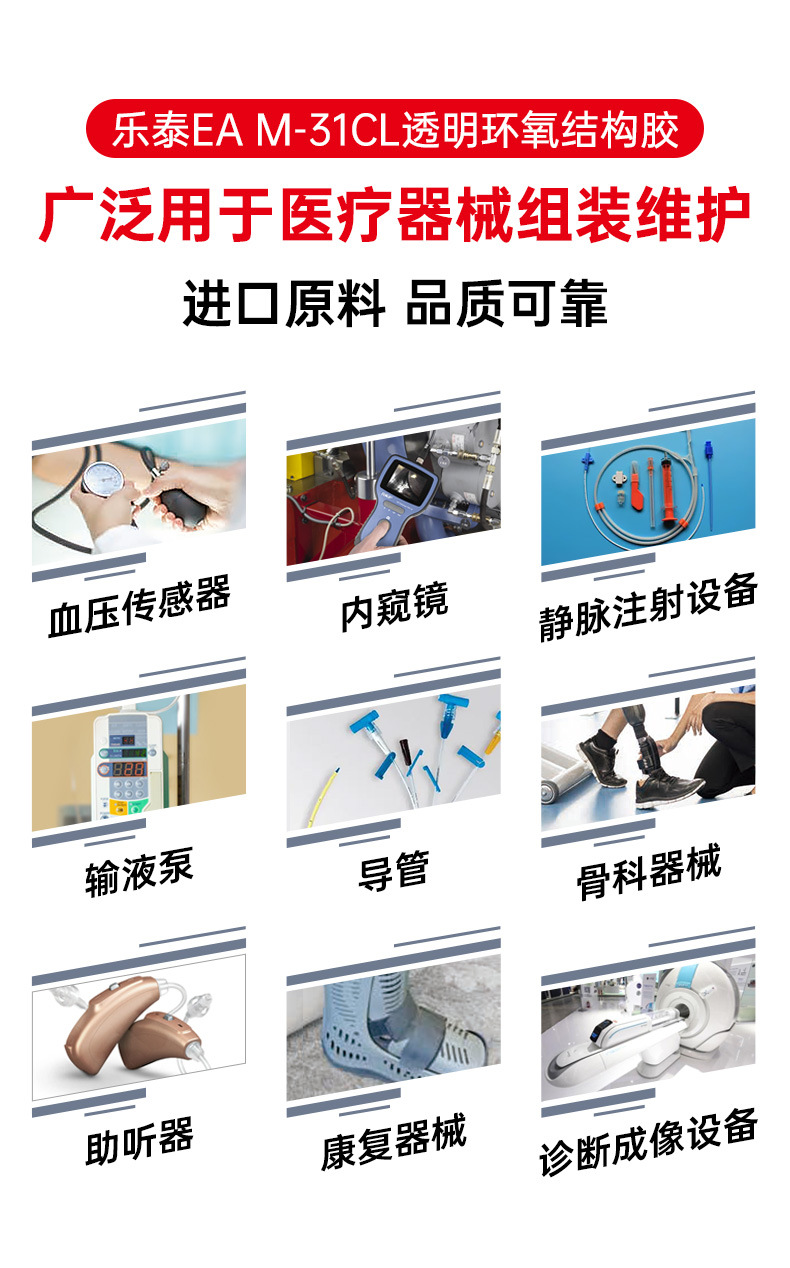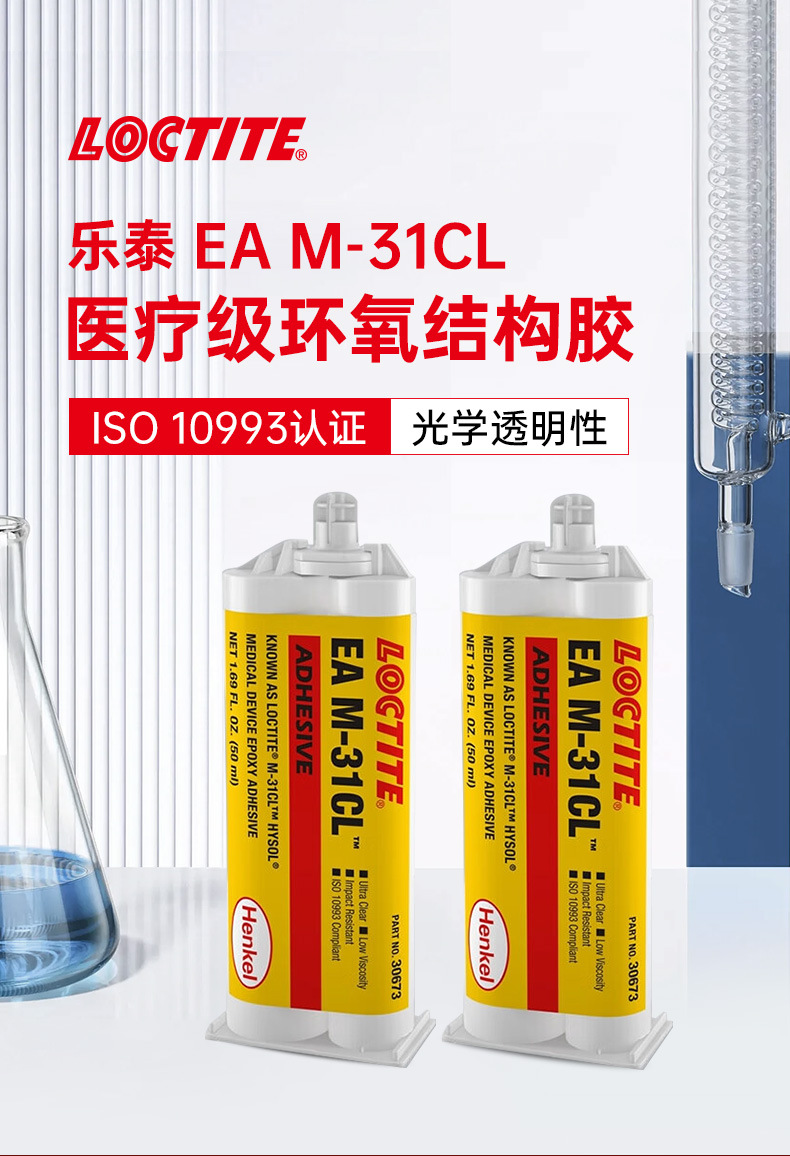 当需要光学透明性及优异的结构、机械和电绝缘性能时,可选择 LOCTITE® EA M-31CL。这款双组分透明(无色至微黄色)低粘度液态环氧树脂粘合剂可在室温下固化,形成超透明胶层,具有优异的抗冲击性和极小的收缩率。其可用于广泛的应用场景,包括粘合、小型灌封、固定及层压等。已通过 ISO 10993 医疗行业认证。