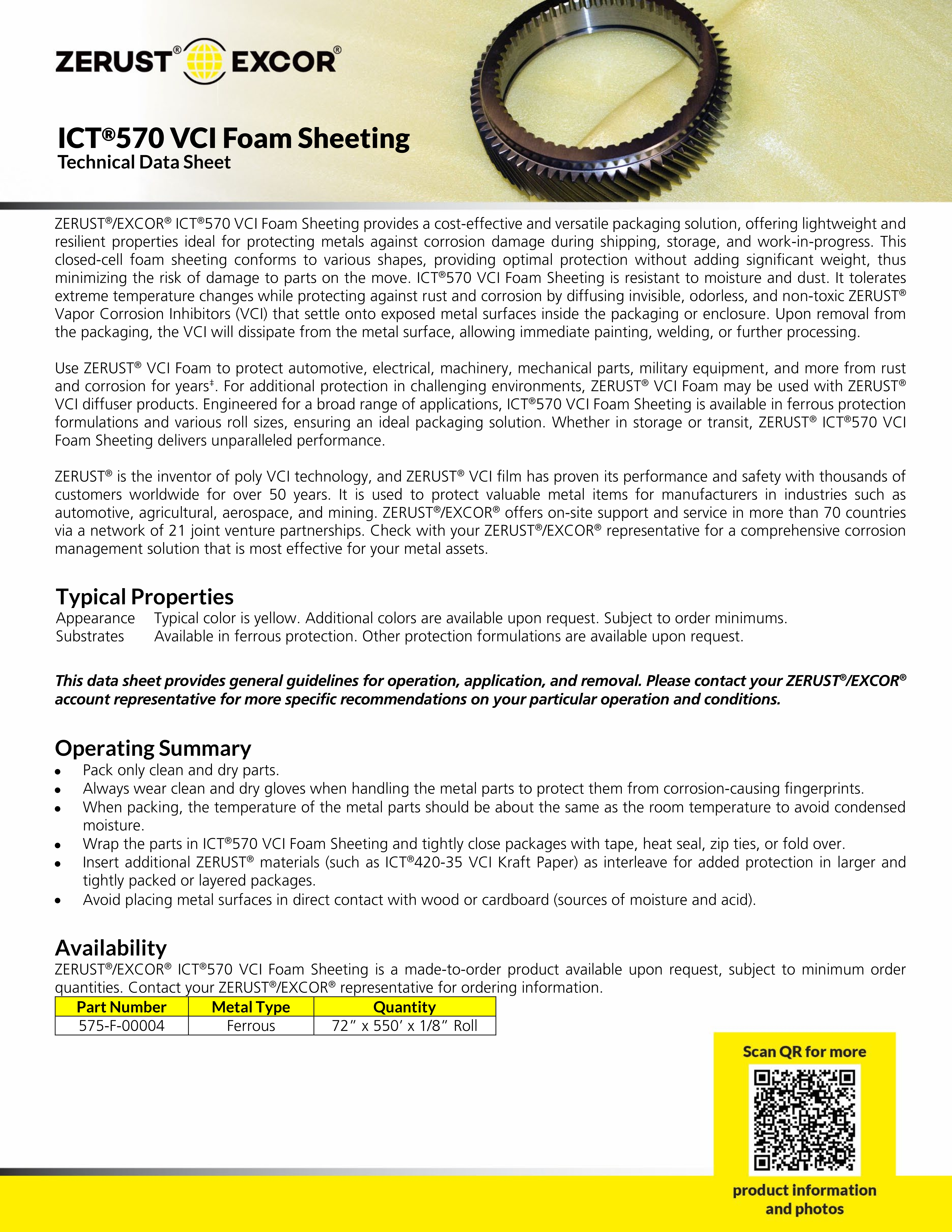 Zerust ICT570 是北美防锈(Zerust/Excor)出品的 VCI 气相防锈泡棉,集缓冲防护与长效防锈于一体,为精密金属零部件的储运保护设计。