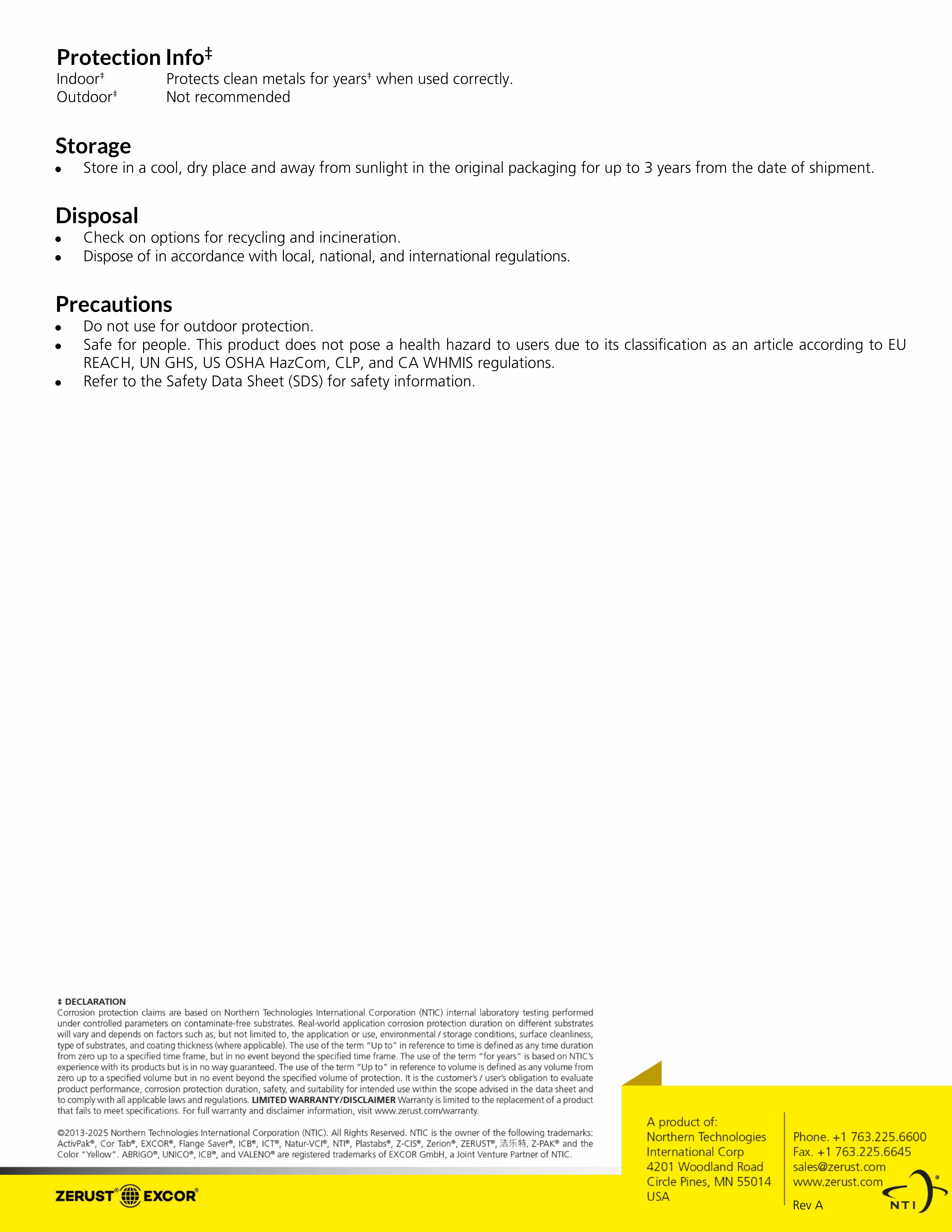 - 可配合 Zerust VCI 袋 / 纸 / 分散剂,强化恶劣环境防护