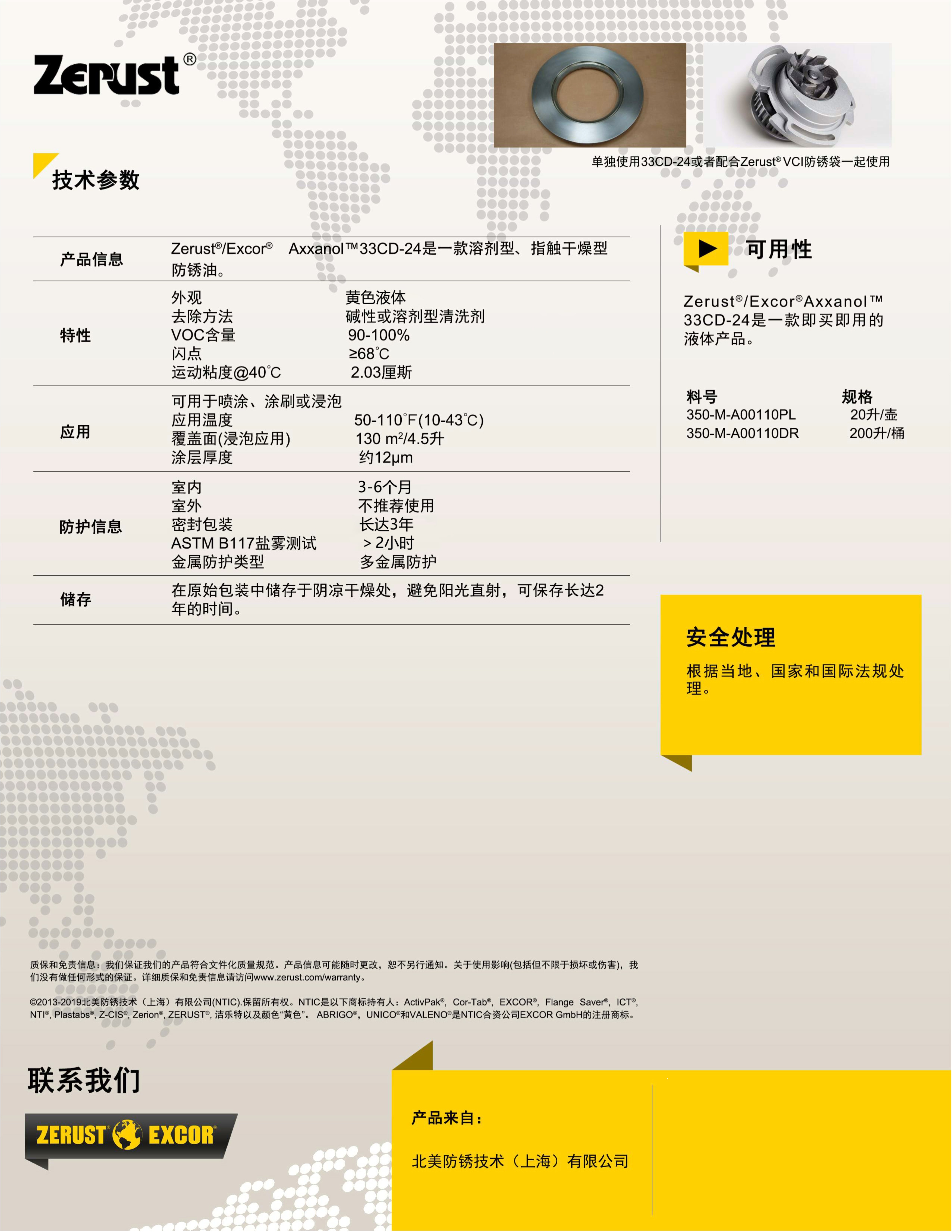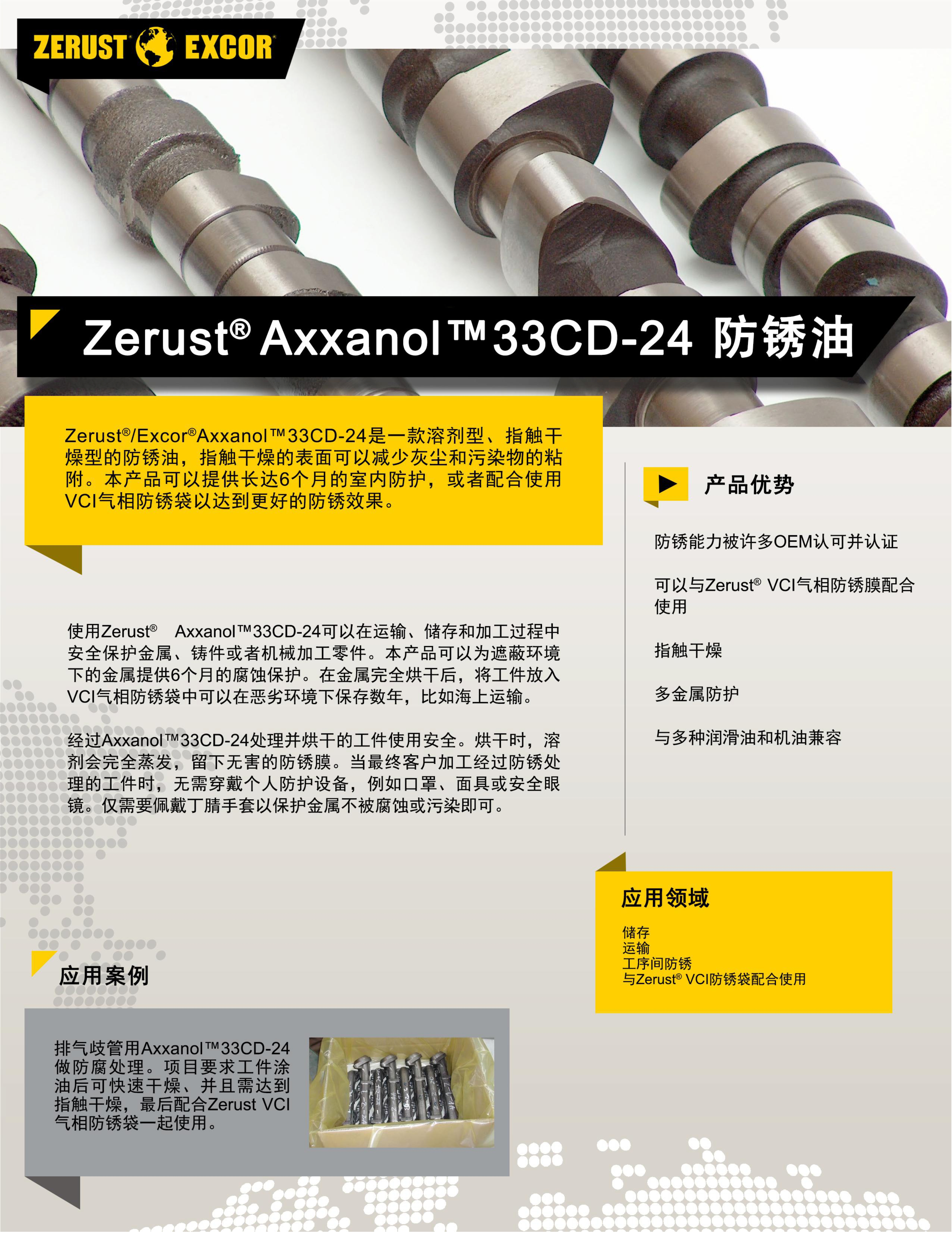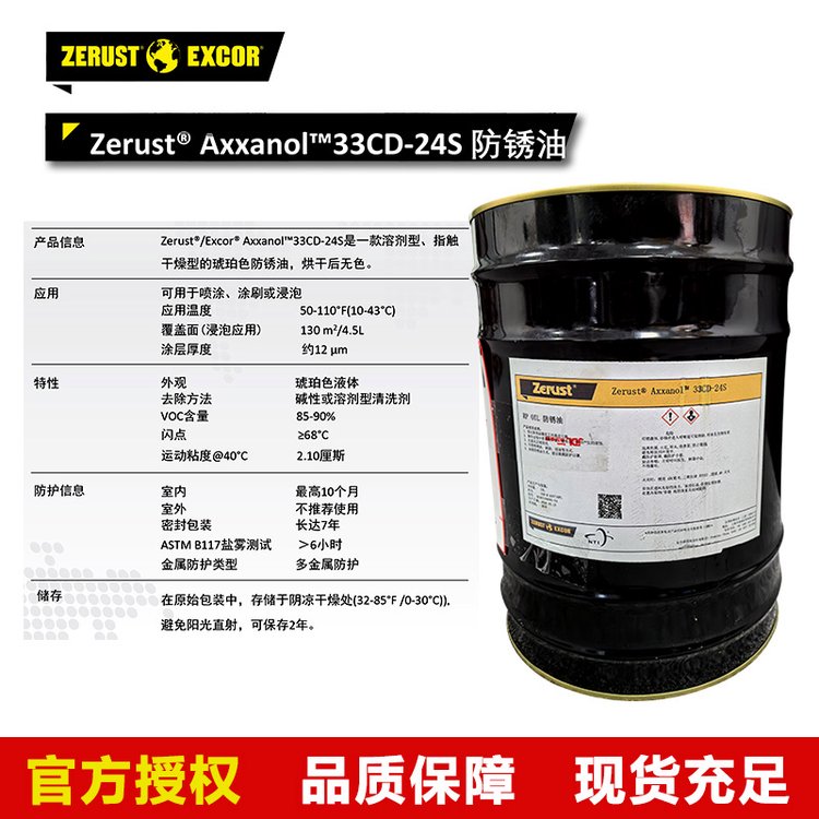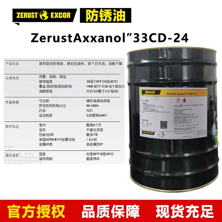 Zerust Axxanol 33CD-24 是北美防锈(Zerust/Excor)旗下一款溶剂型、指触快干的防锈油,核心优势为 “速干、不粘灰、免清洗”,适配室内短期防护与 VCI 包装联用的长时防护场景。
