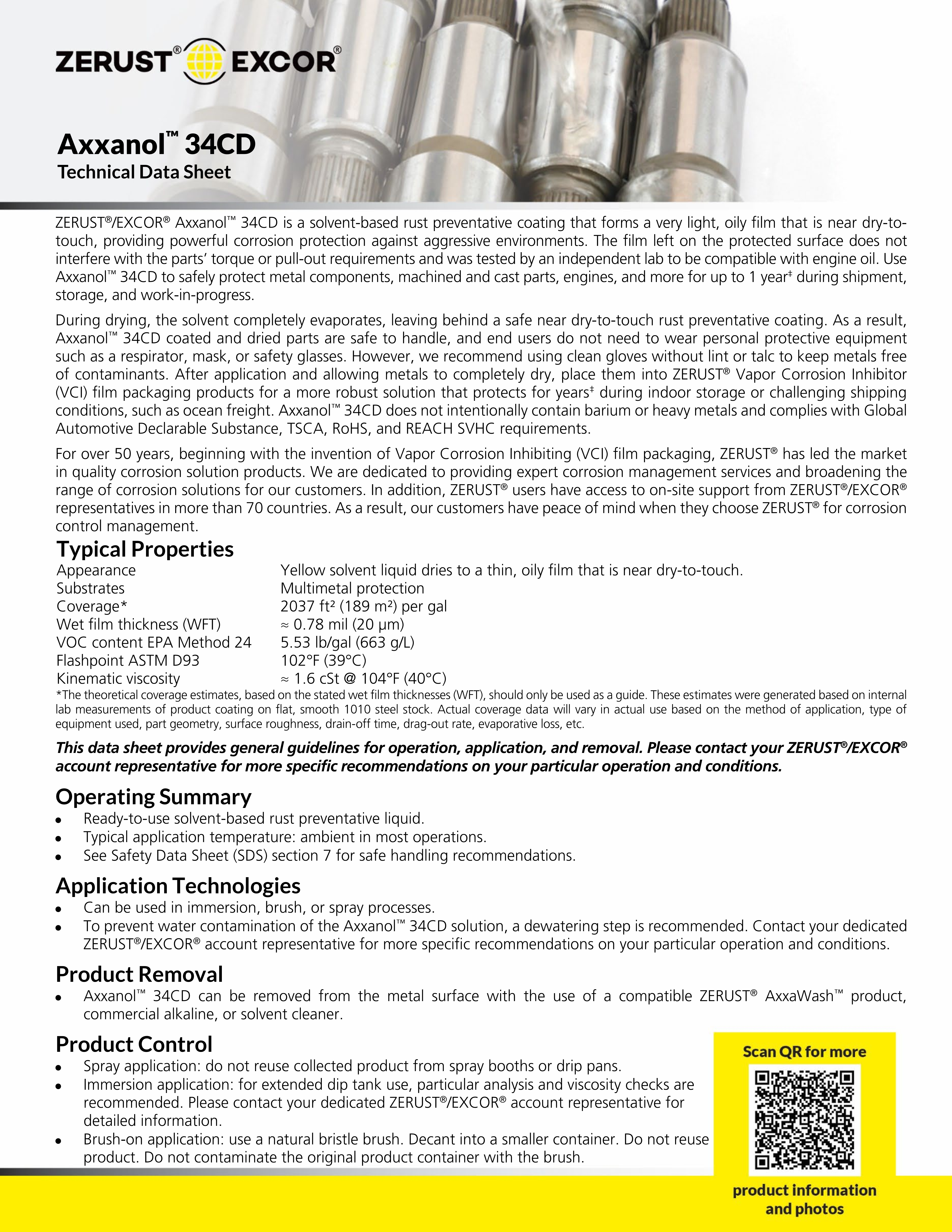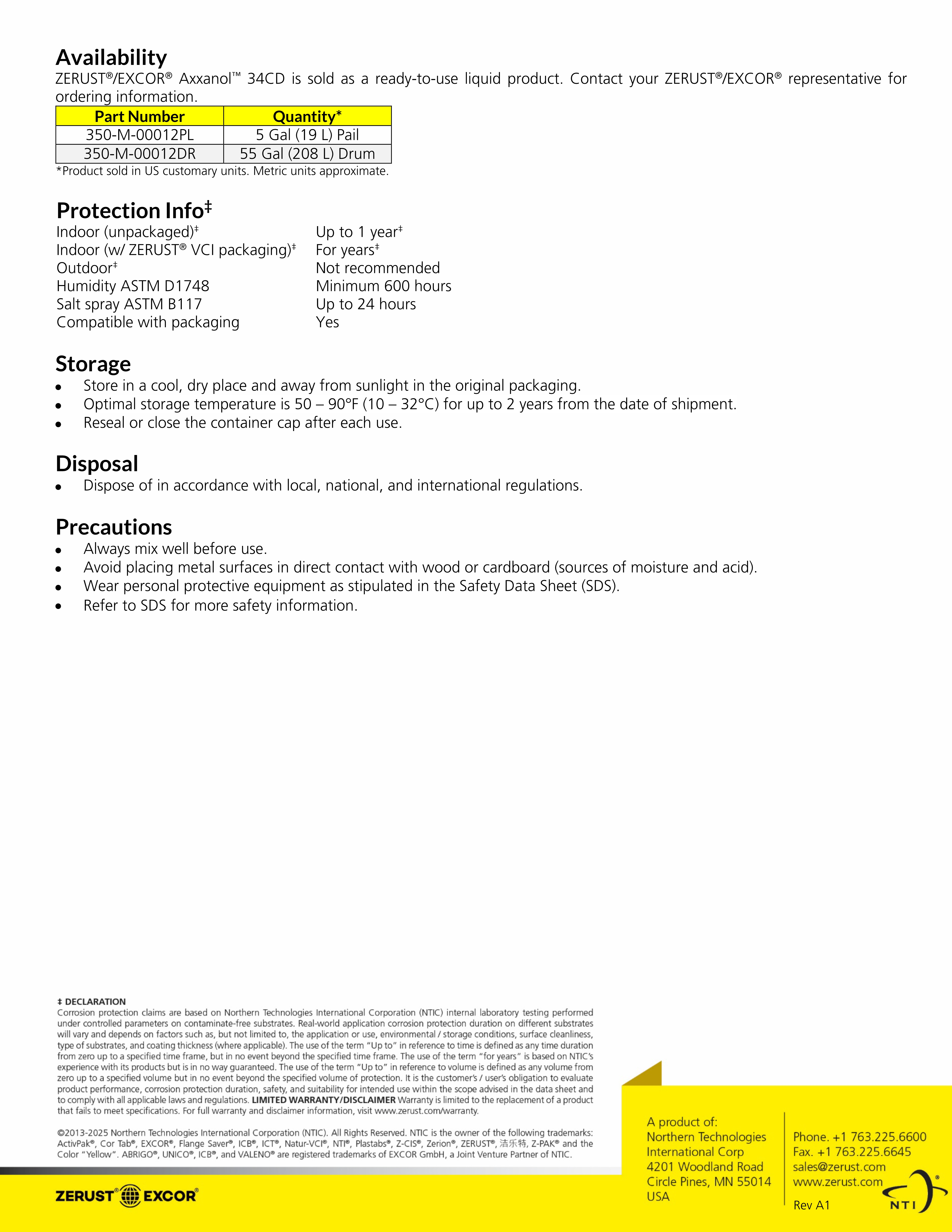 Zerust Axxanol 34CD 是北美防锈(Zerust)一款溶剂型、近干膜(Near dry-to-touch)的长效防锈油,定位介于 33CD-24(完全干膜) 与传统软膜油之间,主打强耐蚀、洁净、中长效防护。