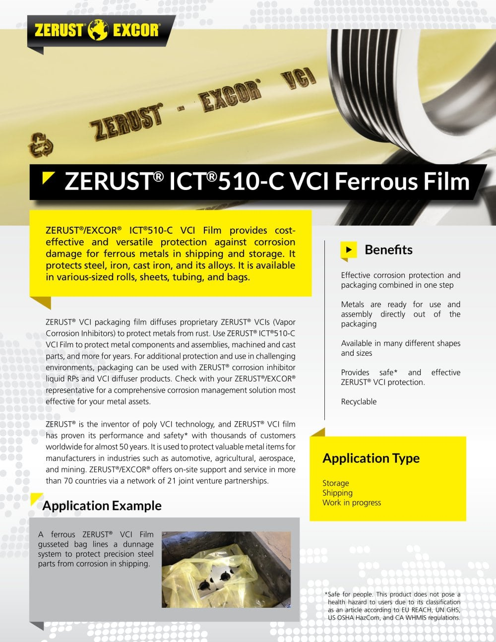 Zerust是VCI气相防锈膜的发明者,Zerust VCI防锈膜已为全球范围内的数千家客户提供了超过40年的服务,证明其优异的性能和安全性。它可用于为汽车、农业、航空航天和采矿等行业的客户提供金属的锈蚀防护。Zerust®/Excor®在全球70多个国家或地区设有分公司或合作伙伴,可提供现场支持和服务。
