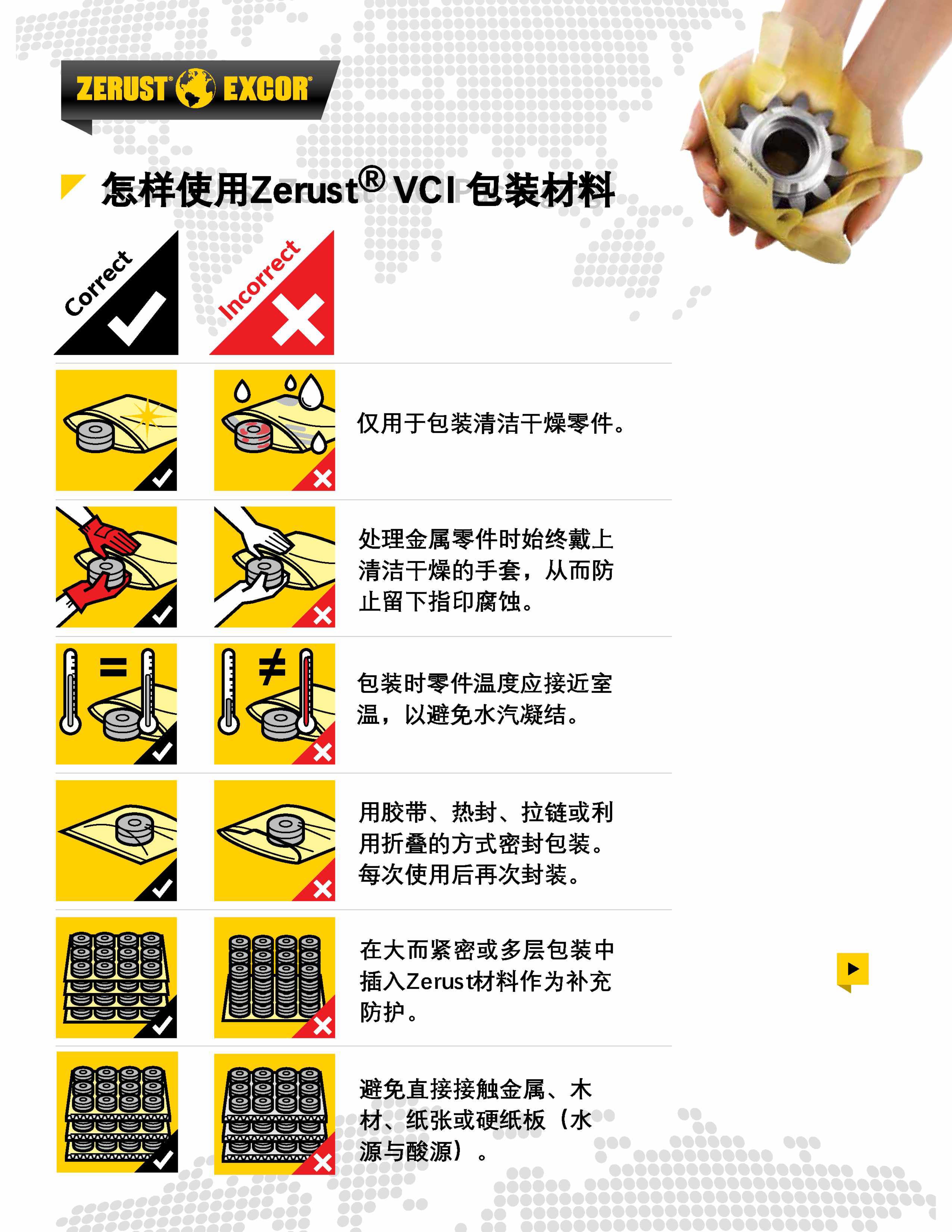 - 避免混用:不可与酸性、含硅、非Zerust防锈/抗氧化产品混用,以免发生化学反应,导致防护失效;不可与热封型防锈膜混用包装。